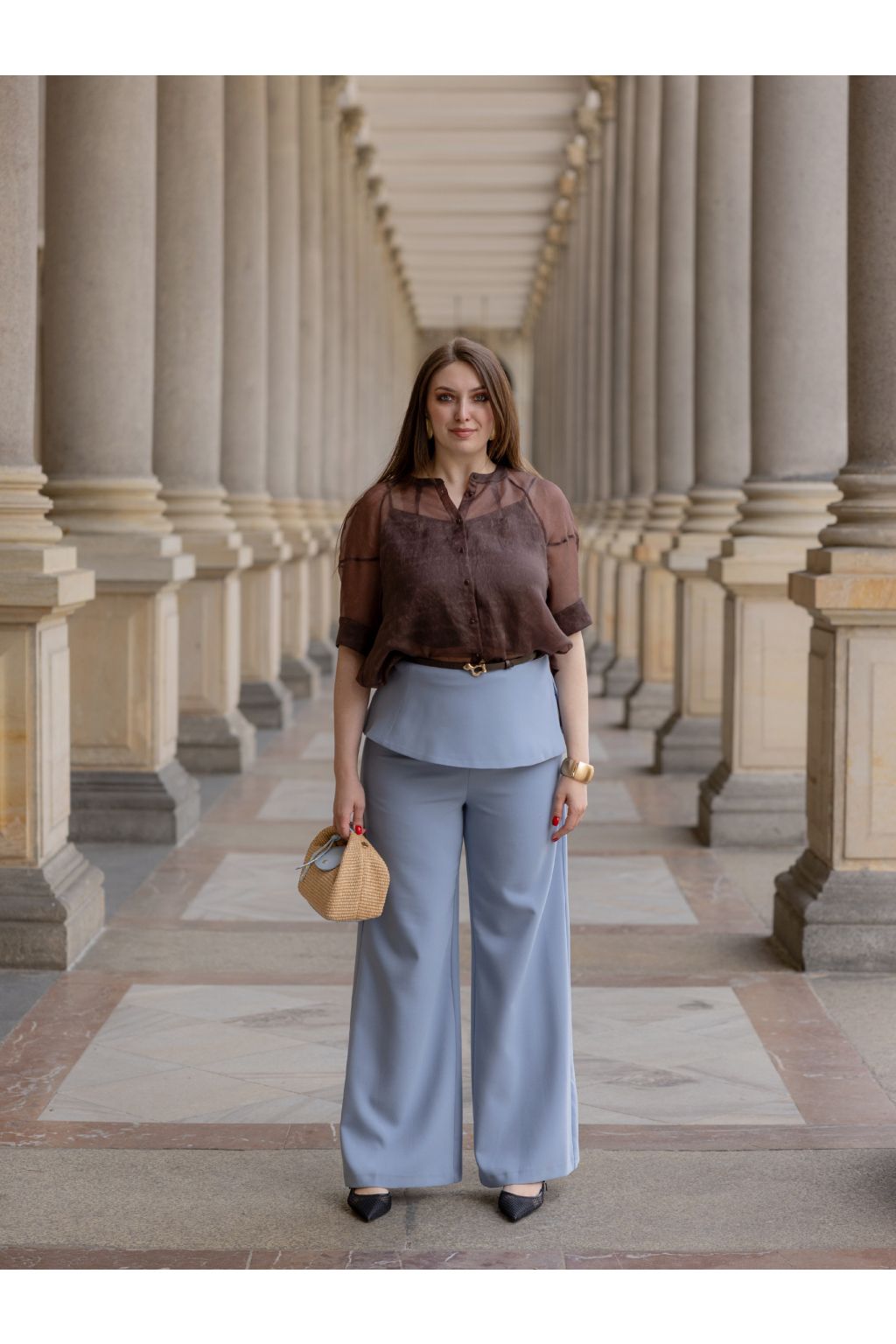 Lehká dámská hnědá košile z jemně transparentního materiálu s volnějším střihem a výraznými rukávy.
