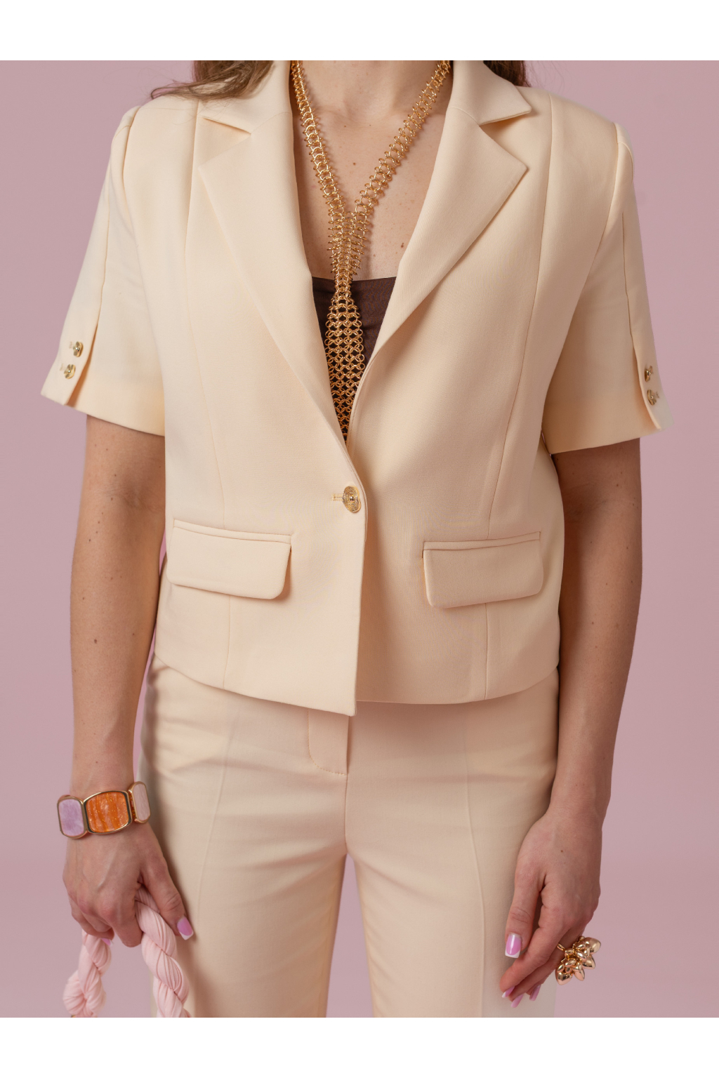 Sako má čisté linie a jemně projmutý střih, který zvýrazní siluetu, aniž by působil striktně. Působí žensky, elegantně a snadno se kombinuje i samostatně – například s džínami nebo sukní.