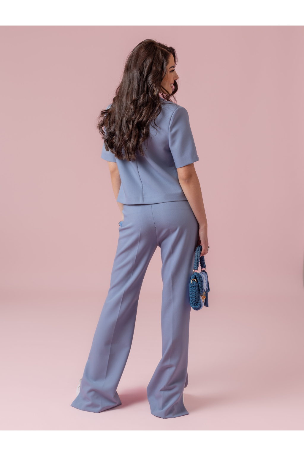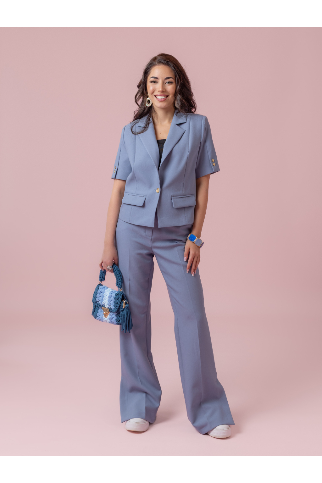 Elegantní dámský kostým tvořený sakem a kalhotami v moderním střihu.