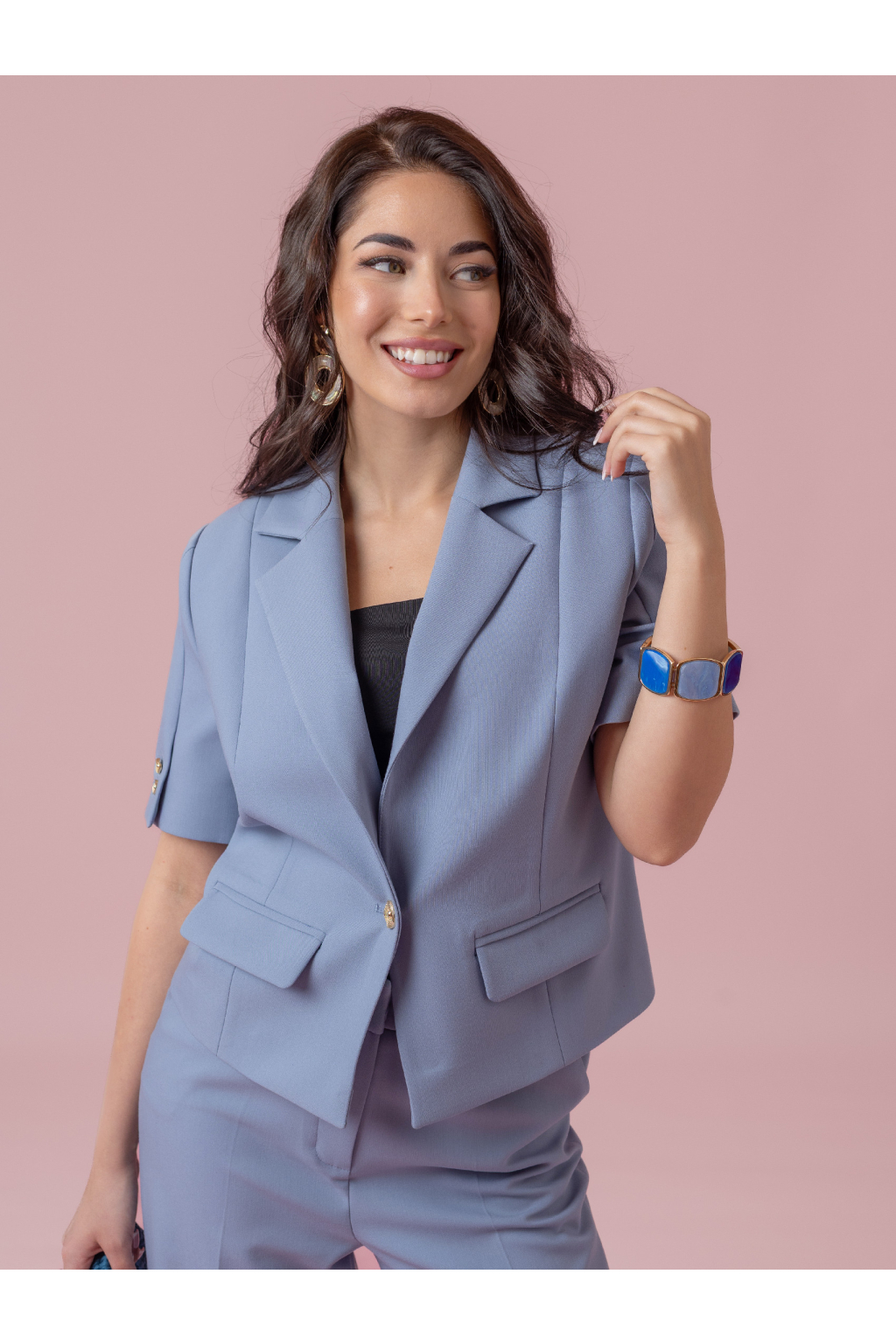 Sako má čisté linie a jemně projmutý střih, který zvýrazní siluetu, aniž by působil striktně. Působí žensky, elegantně a snadno se kombinuje i samostatně – například s džínami nebo sukní.