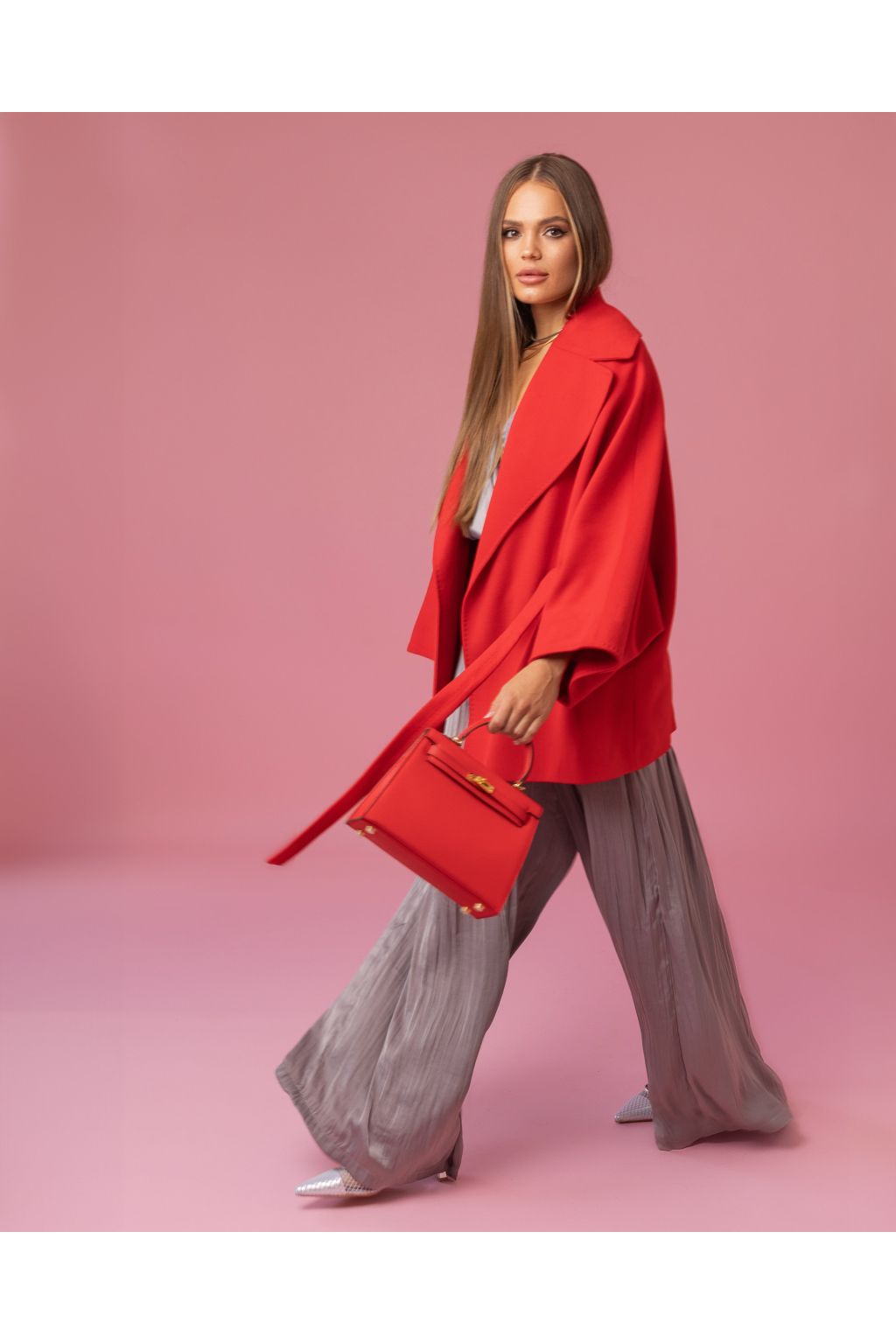 Horní část overalu je řešena hlubším véčkovým výstřihem s překládaným efektem, který opticky prodlužuje siluetu a působí velmi elegantně. Bezrukávové provedení dodává modelu lehkost a je ideální pro teplejší dny i slavnostní večerní akce. Pas je zvýrazněn, což pomáhá vytvořit ženské proporce a zvýraznit siluetu.