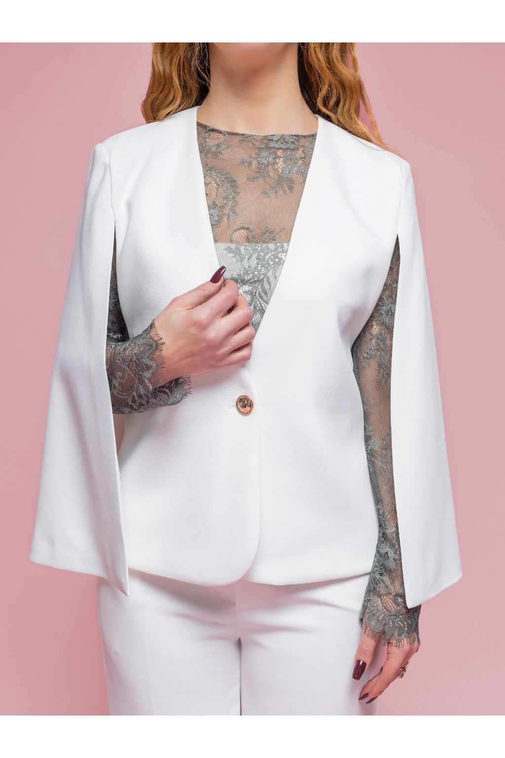 Volnější, lehce projmutý střih krásně splývá s postavou a vytváří elegantní siluetu bez pocitu staženosti. Motýlkové rukávy vyniknou zejména v pohybu a dodávají outfitu jemnou dynamiku a luxusní vzhled. Jednoduché zapínání na jeden ozdobný knoflík, čisté linie a absence zbytečných detailů zajišťují nadčasovost a snadnou kombinovatelnost.