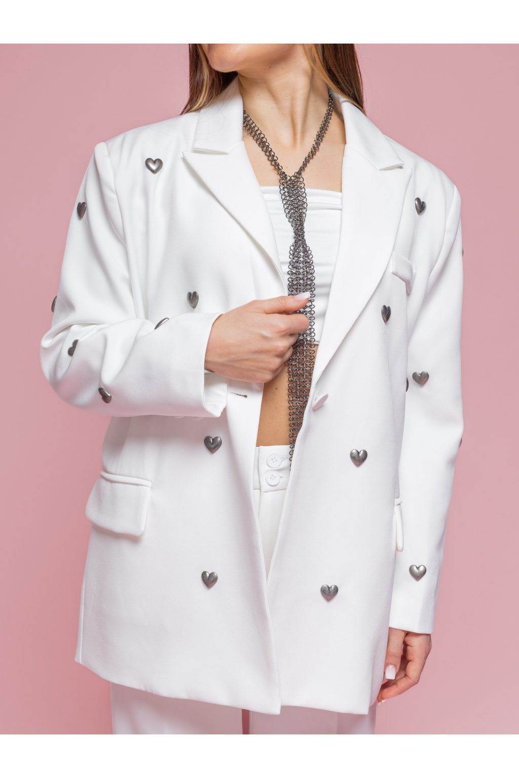 Elegantní dámské sako s jemnými kovovými srdíčky, které dodávají klasickému střihu hravý a ženský detail.
