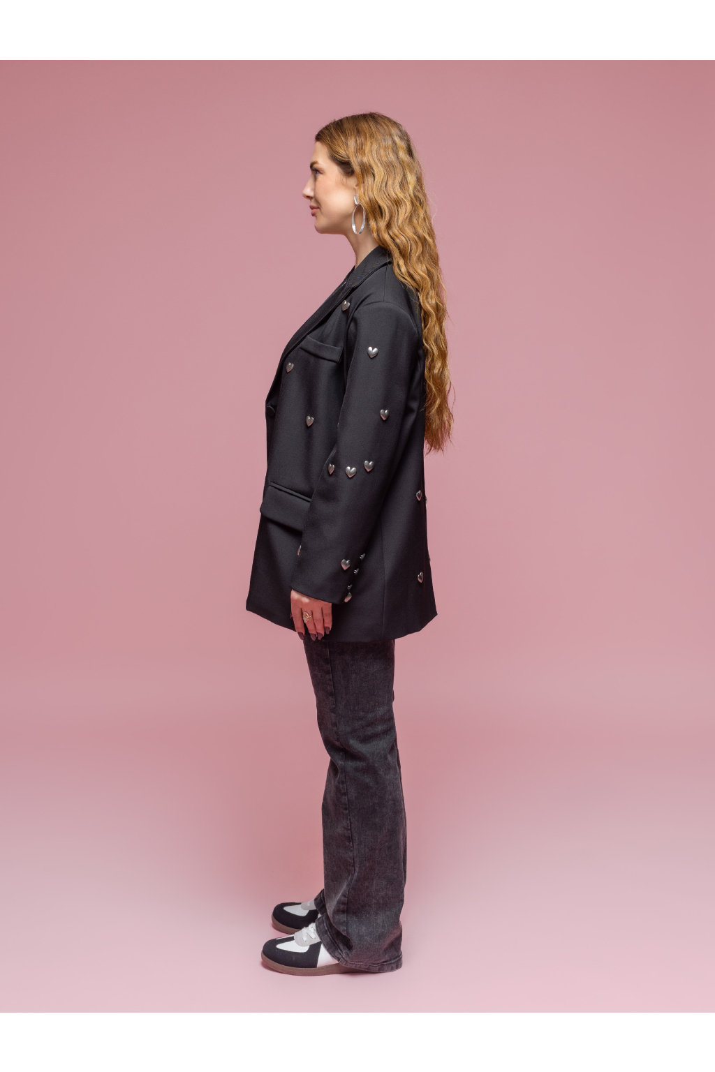 Dámské sako se srdíčky spojuje nadčasový střih s jemným detailem, který si všimnete až zblízka. Drobná kovová srdíčka dodávají modelu osobitost a ženskost, aniž by působila přehnaně. Právě tento detail dělá ze saka výjimečný kousek, který se snadno stane dominantou outfitu.