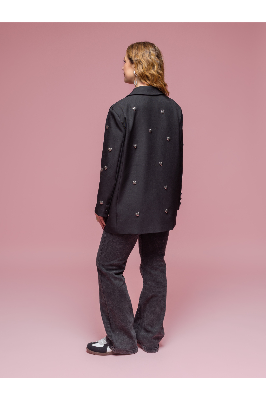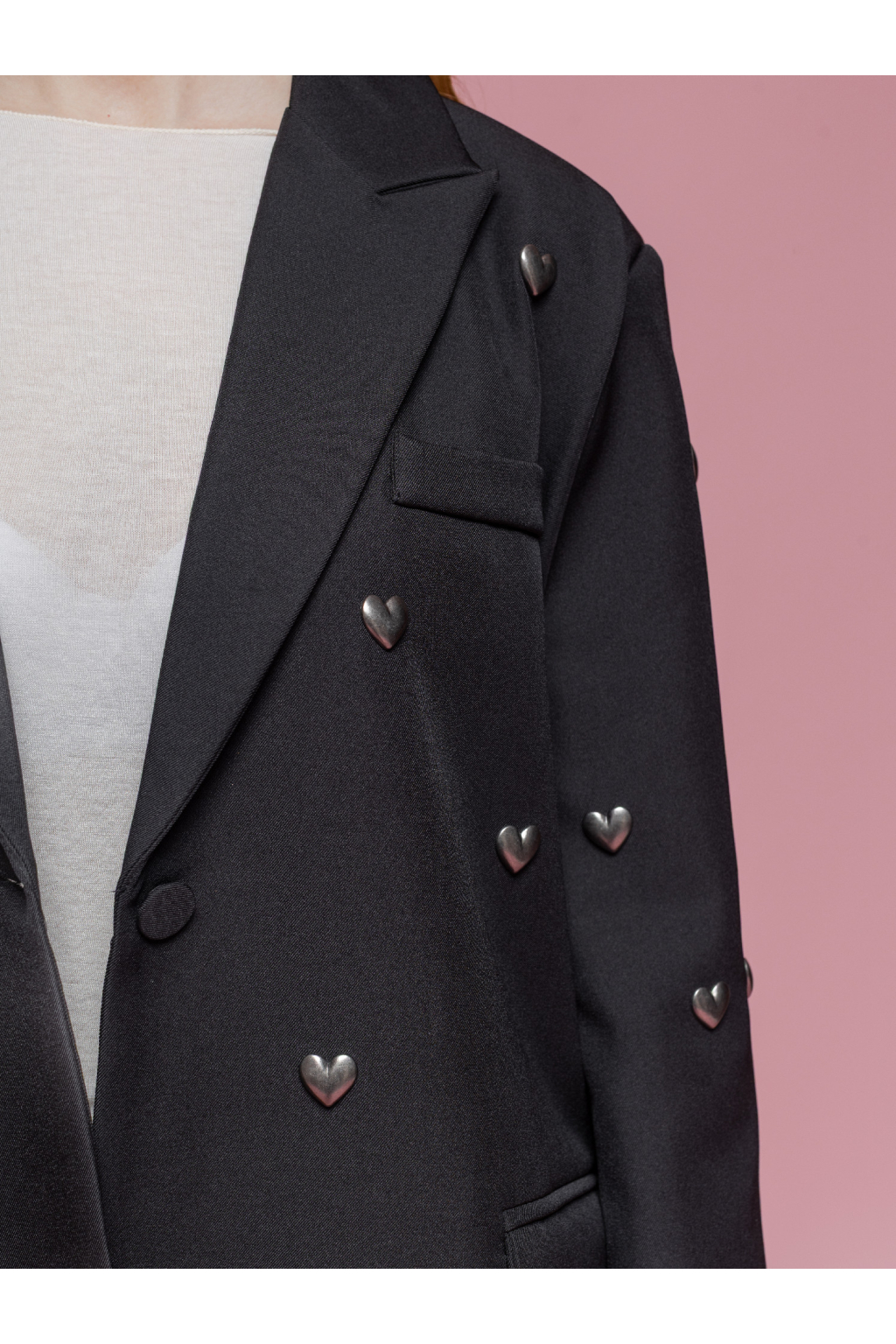 Elegantní dámské sako s jemnými kovovými srdíčky, které dodávají klasickému střihu hravý a ženský detail.