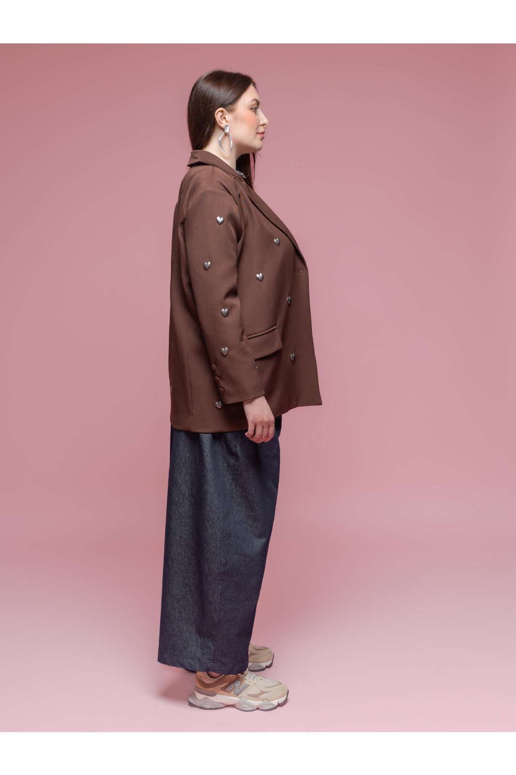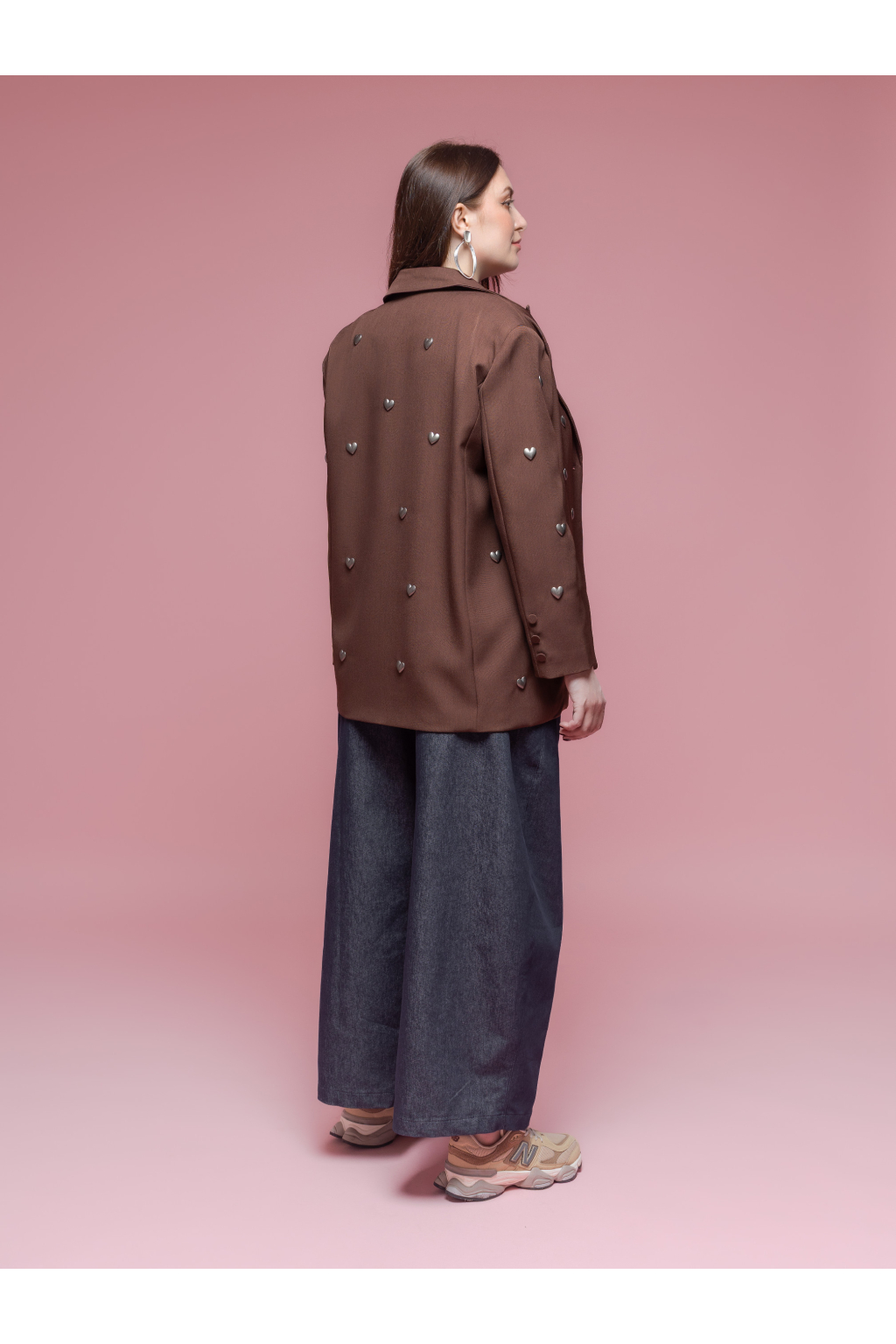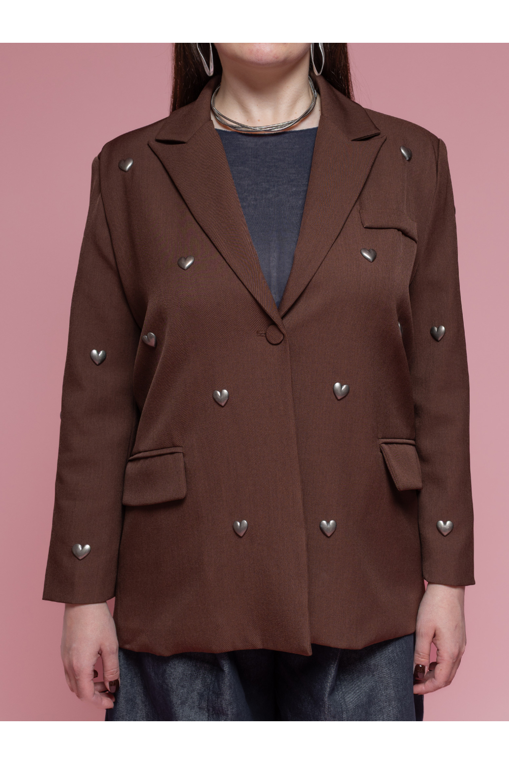 Elegantní dámské sako s jemnými kovovými srdíčky, které dodávají klasickému střihu hravý a ženský detail.