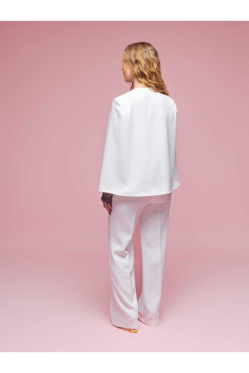 Volnější, lehce projmutý střih krásně splývá s postavou a vytváří elegantní siluetu bez pocitu staženosti. Motýlkové rukávy vyniknou zejména v pohybu a dodávají outfitu jemnou dynamiku a luxusní vzhled. Jednoduché zapínání na jeden ozdobný knoflík, čisté linie a absence zbytečných detailů zajišťují nadčasovost a snadnou kombinovatelnost.