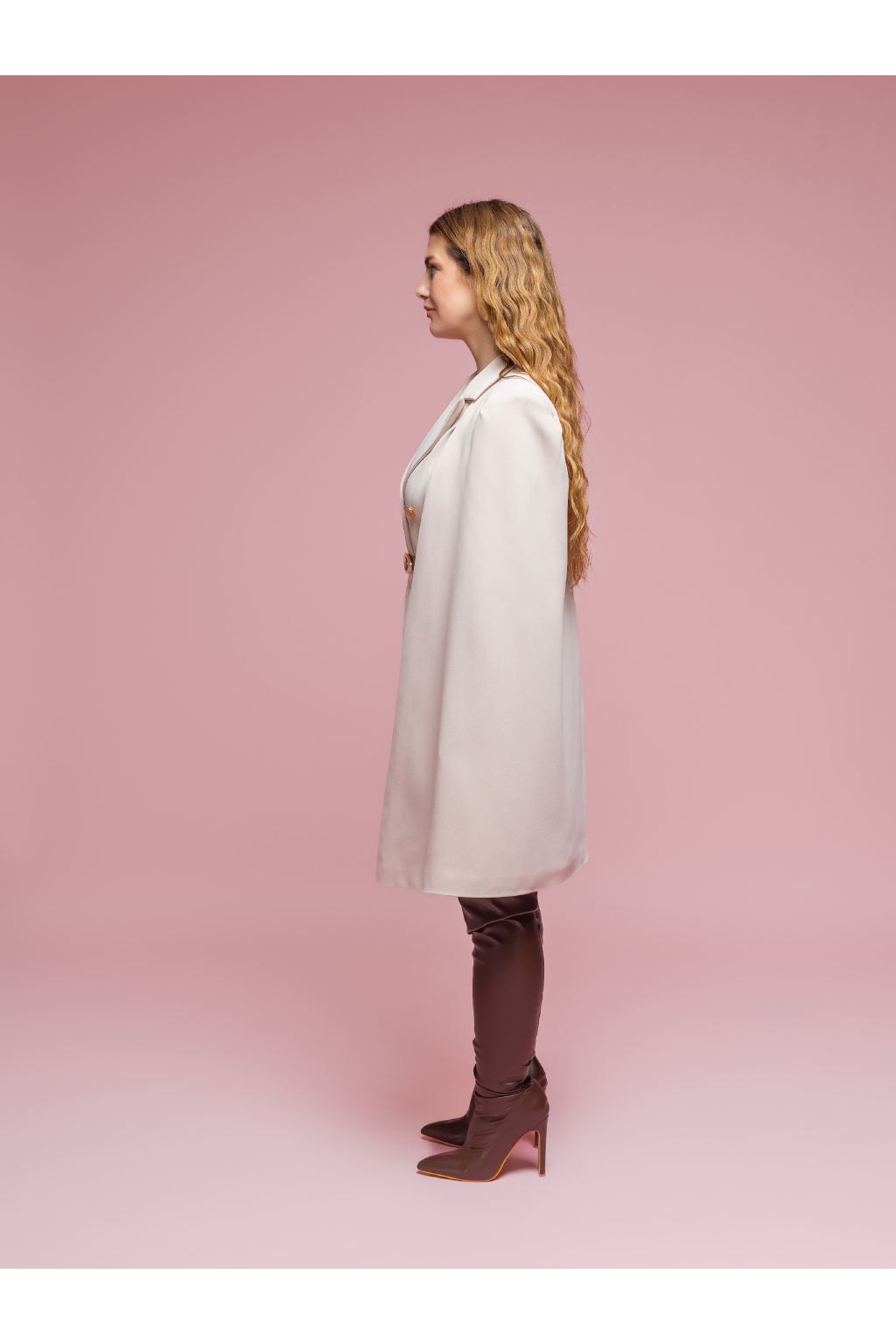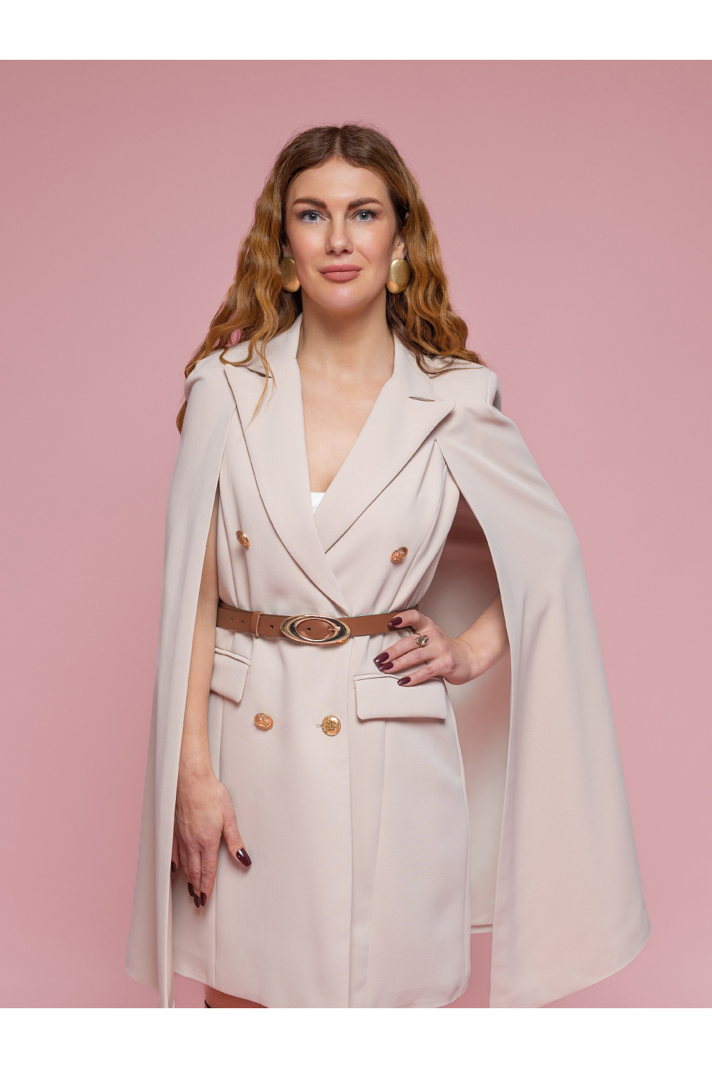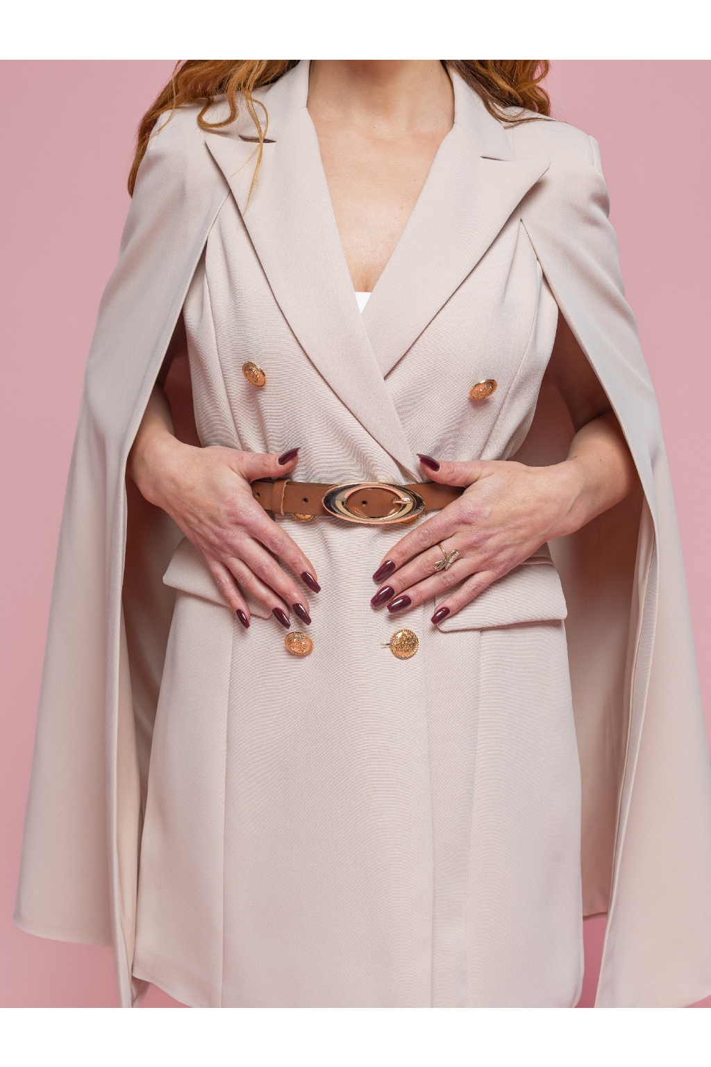 Dvouřadé zapínání se zlatými knoflíky podtrhuje luxusní vzhled a dodává modelu strukturu. Prodloužený střih umožňuje nosit tento kousek jako sako i jako samostatné šaty. Klopy, kapsy a precizní linie zajišťují nadčasový, sofistikovaný styl.