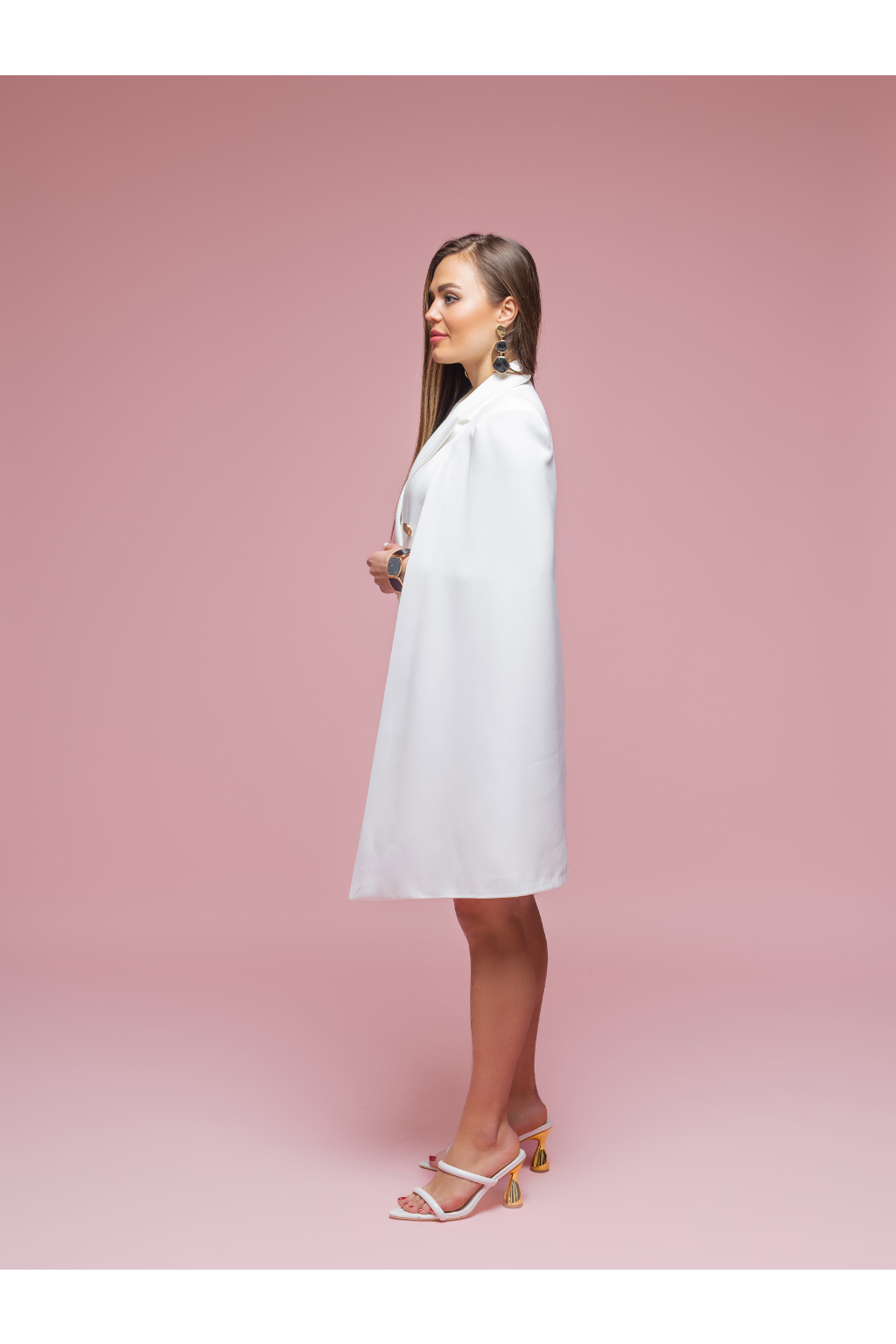Dvouřadé zapínání se zlatými knoflíky podtrhuje luxusní vzhled a dodává modelu strukturu. Prodloužený střih umožňuje nosit tento kousek jako sako i jako samostatné šaty. Klopy, kapsy a precizní linie zajišťují nadčasový, sofistikovaný styl.