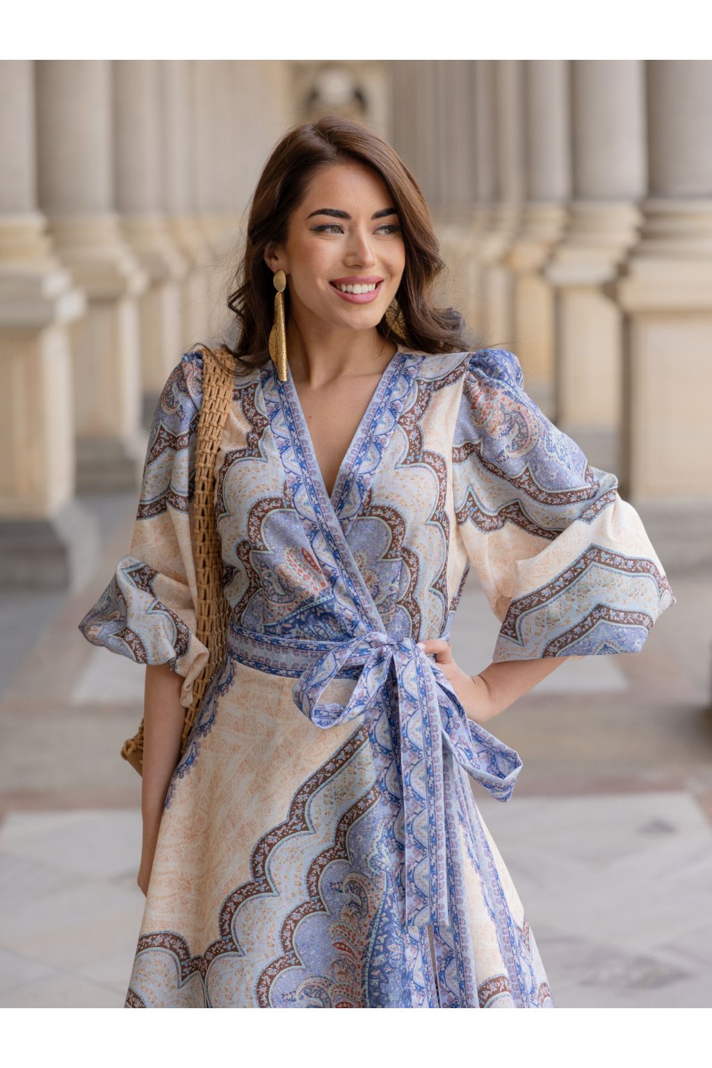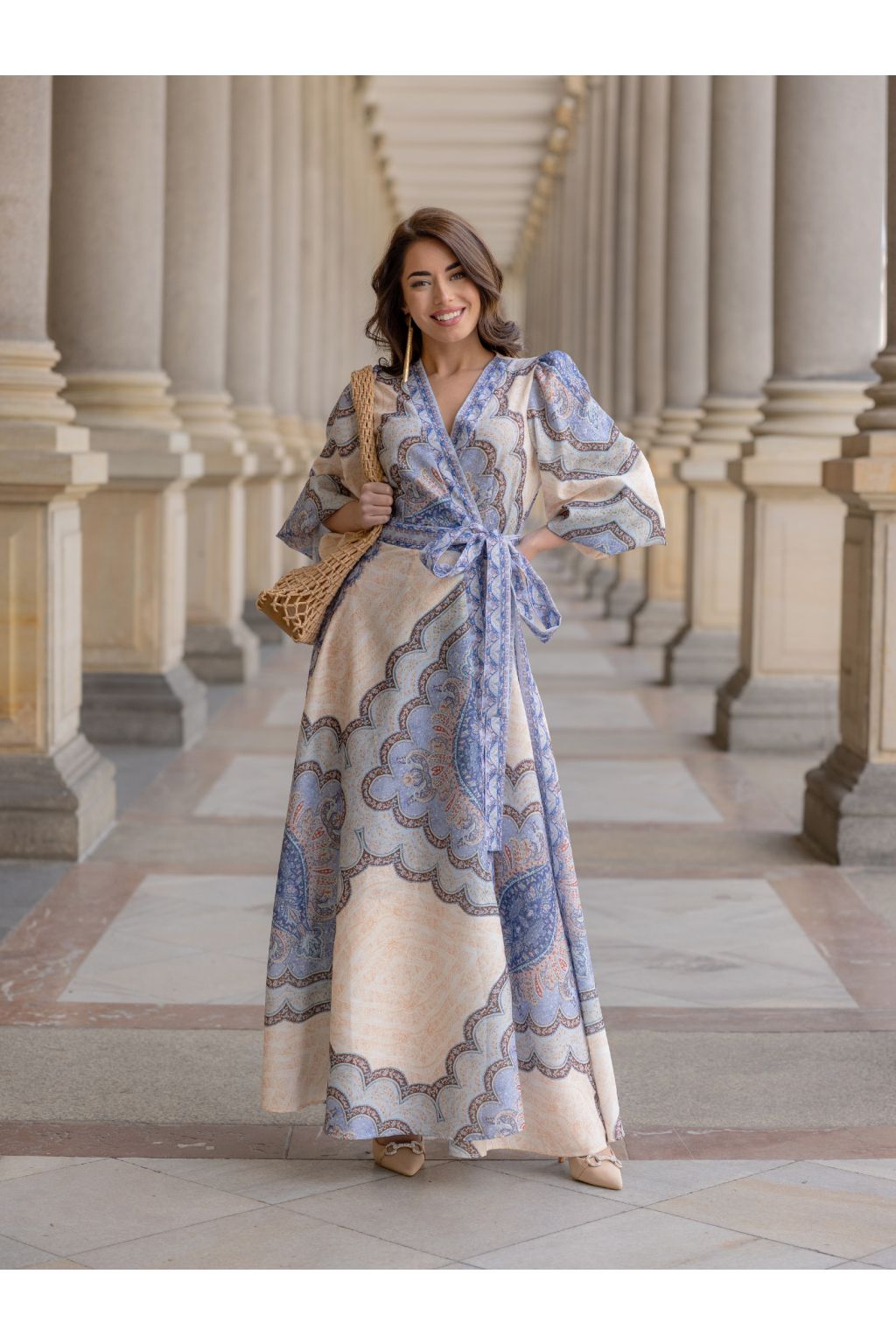 Dámské šaty v jemných modro-béžových tónech zaujmou na první pohled bohatým ornamentálním vzorem a splývavým materiálem. Zavinovací střih s páskem v pase umožňuje přizpůsobení postavě a zároveň vytváří ženskou siluetu.