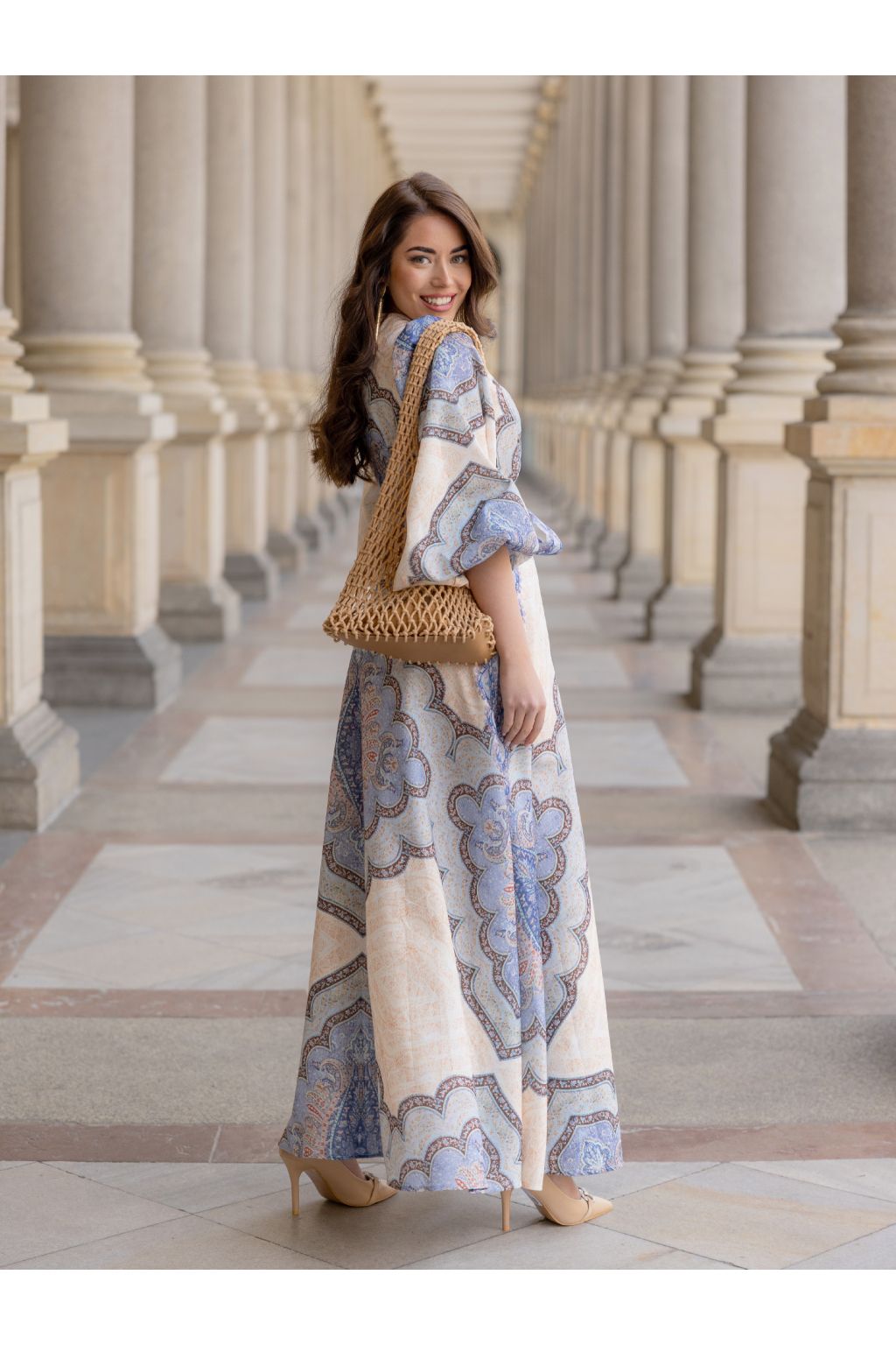 Volnější rukávy dodávají modelu lehkost a pohodlí, zatímco dlouhá sukně působí elegantně a vzdušně při každém pohybu. Šaty jsou ideální volbou pro teplé dny, dovolenou i stylové městské nošení.