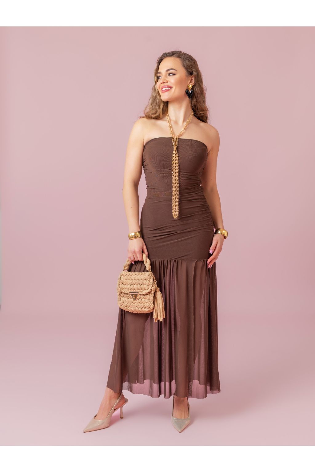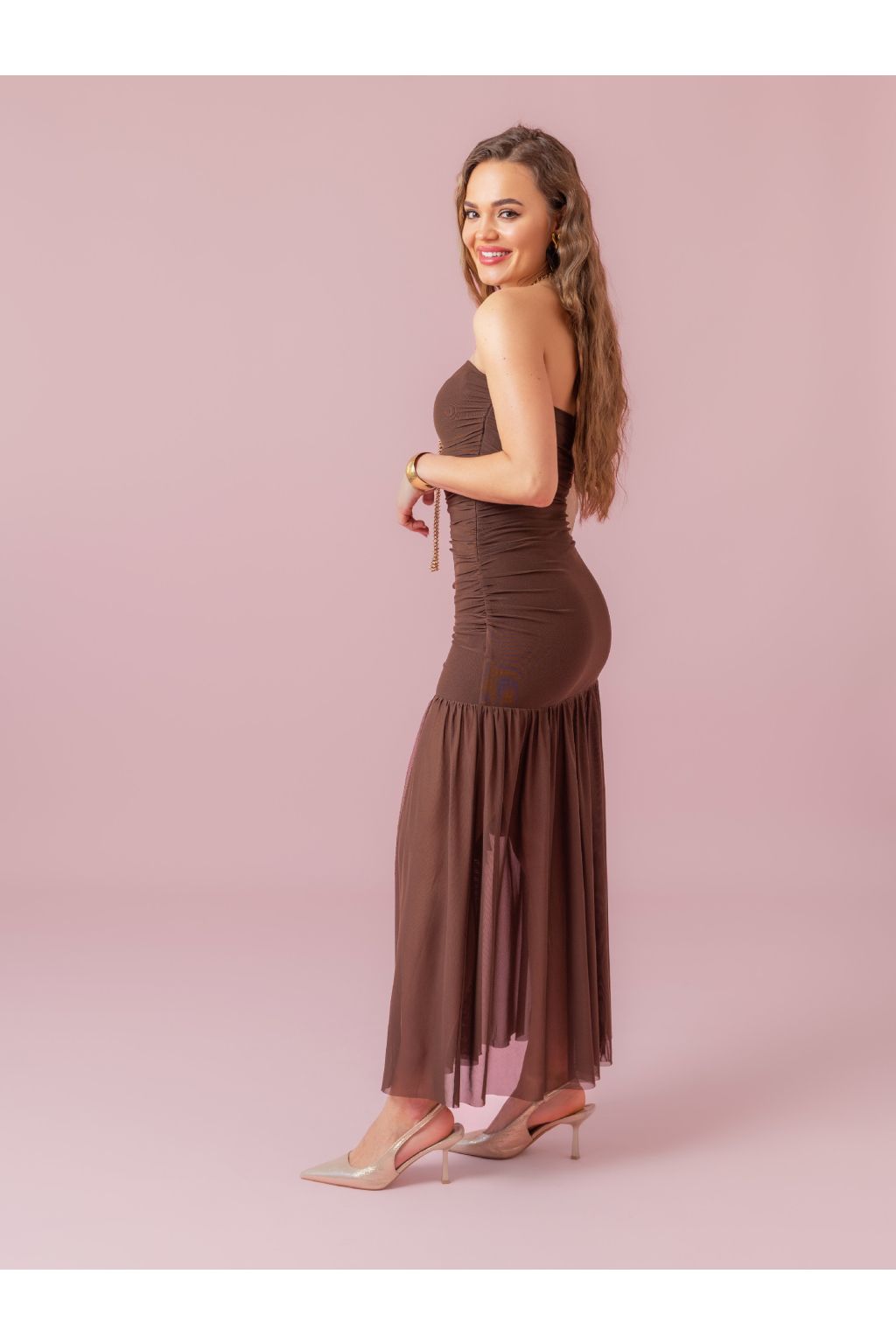 Hnědé šaty bez rukávů s odhalenými rameny a transparentní sukní.