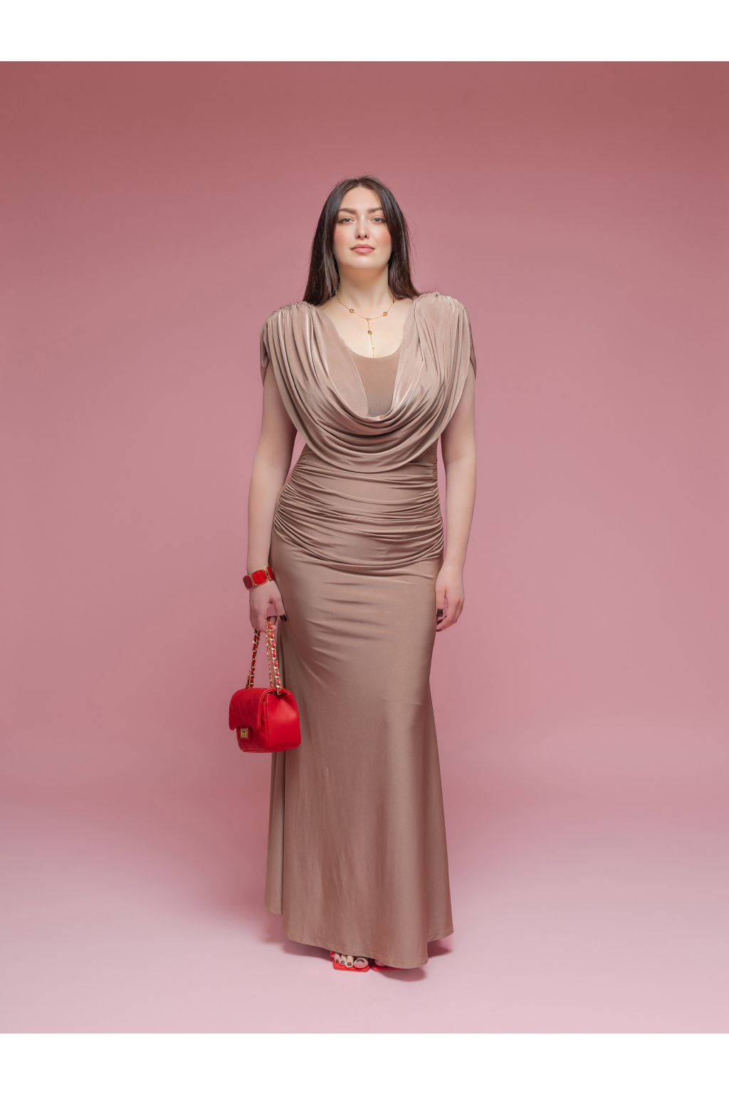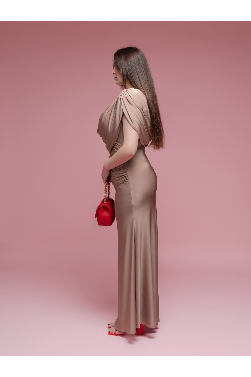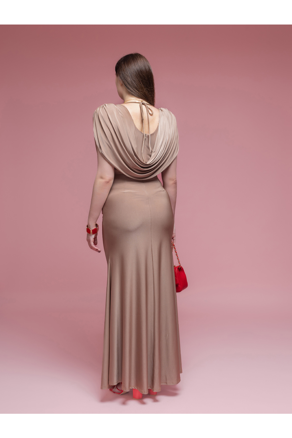 Elegantní dlouhé dámské šaty v béžovém odstínu s efektním řasením v pase, splývavou siluetou a hlubším zadním výstřihem s vázáním. Sofistikovaný model, který zvýrazní ženské křivky a působí luxusně při každé společenské příležitosti.