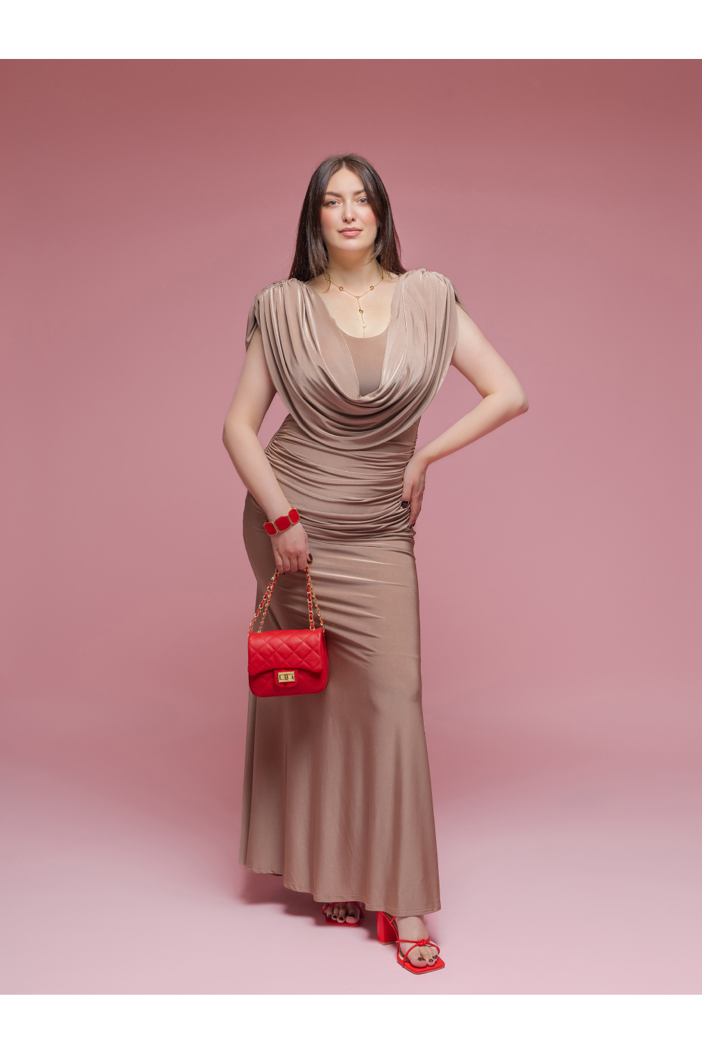 Smyslná elegance v nadčasovém provedení. Dámské šaty v béžové barvě zaujmou propracovaným střihem, který kombinuje jemnost materiálu s výraznými detaily. Horní část je řešena splývavě, s efektně nařaseným dekoltem a otevřenější zadní partií, která dodává modelu lehce dramatický, ale stále velmi elegantní charakter.