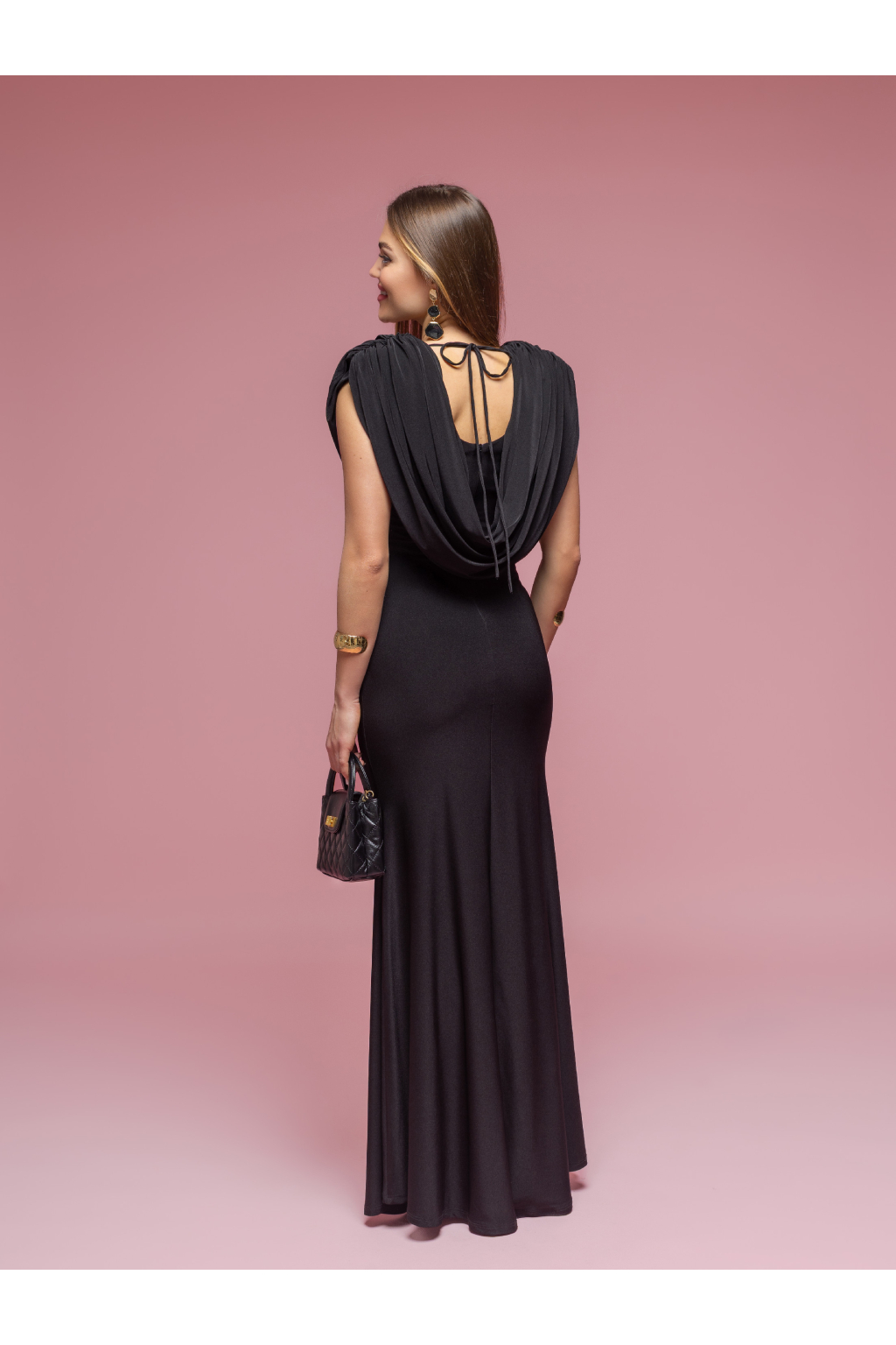 Elegantní dlouhé dámské šaty v černé barvě s efektním řasením v pase, splývavou siluetou a hlubším zadním výstřihem s vázáním.