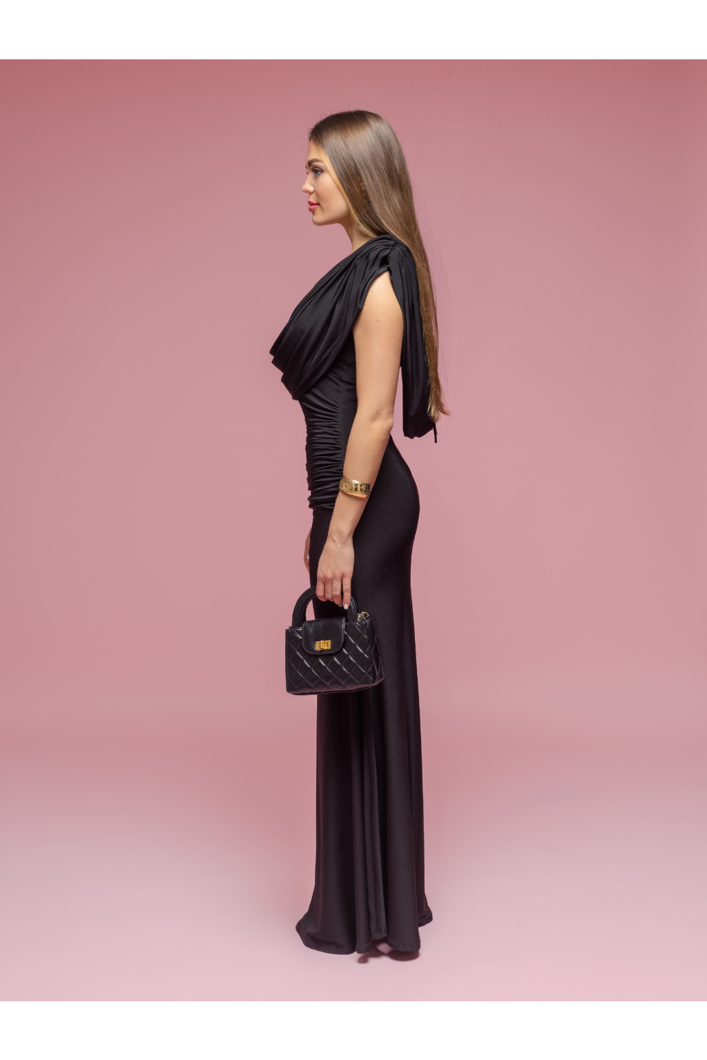 Šaty mají přiléhavý střih v oblasti pasu a boků, kde je použito řasení, které krásně tvaruje postavu a zároveň opticky lichotí siluetě. Dlouhá sukně plynule navazuje na horní část a při chůzi vytváří elegantní, plynulý pohyb. Zadní zapínání na skrytý zip zajišťuje pohodlné oblékání a zachovává čistý, luxusní vzhled.