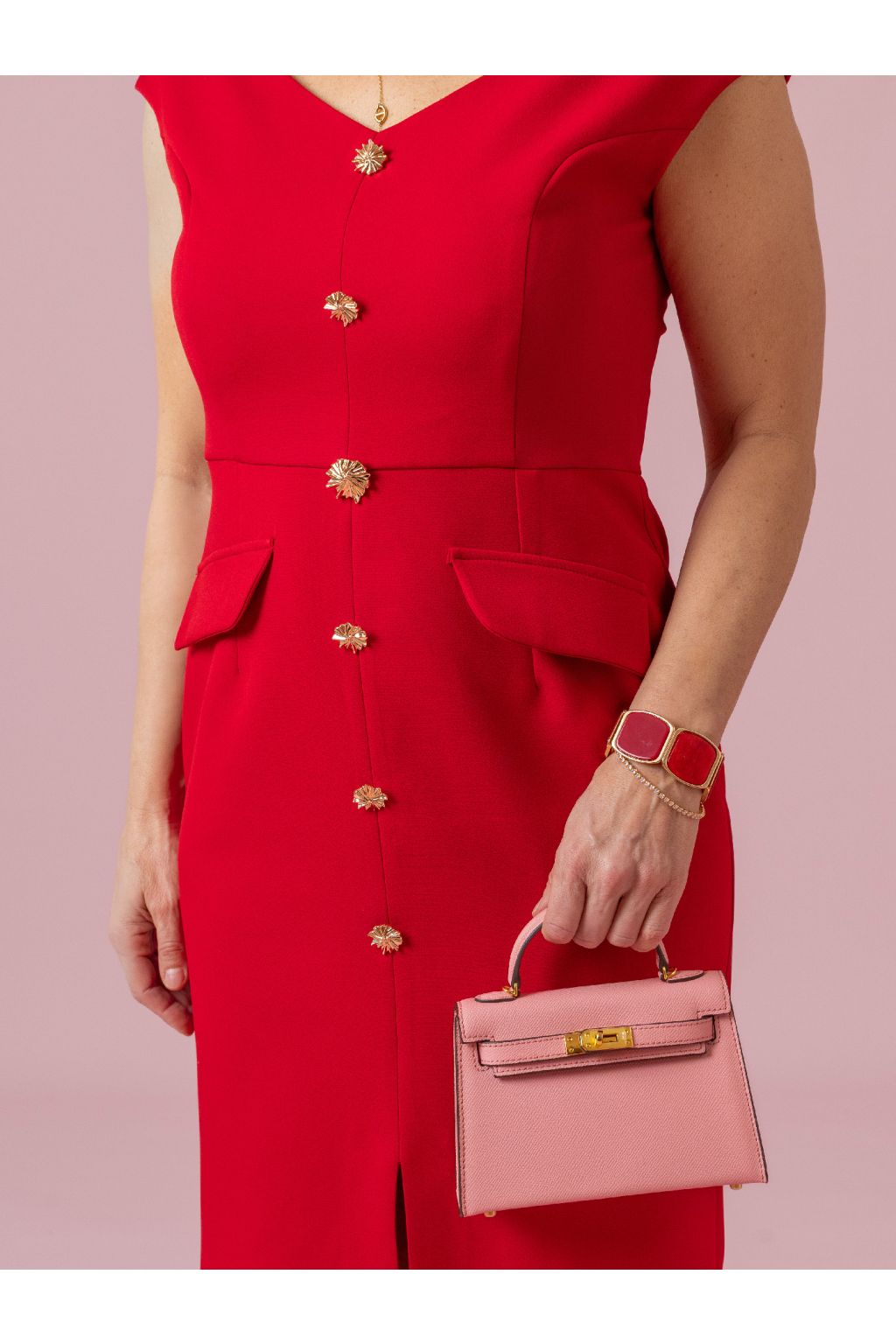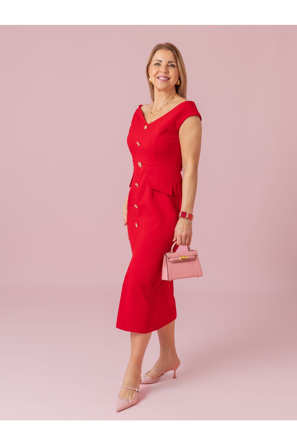 Výstřih odhalující ramena působí velmi sofistikovaně a zároveň přitažlivě. Ozdobné knoflíky v přední části dodávají modelu luxusní detail, který zaujme na první pohled. Rozparek pak přidává lehkost, pohyb a jemnou dávku sebevědomí při každém kroku.