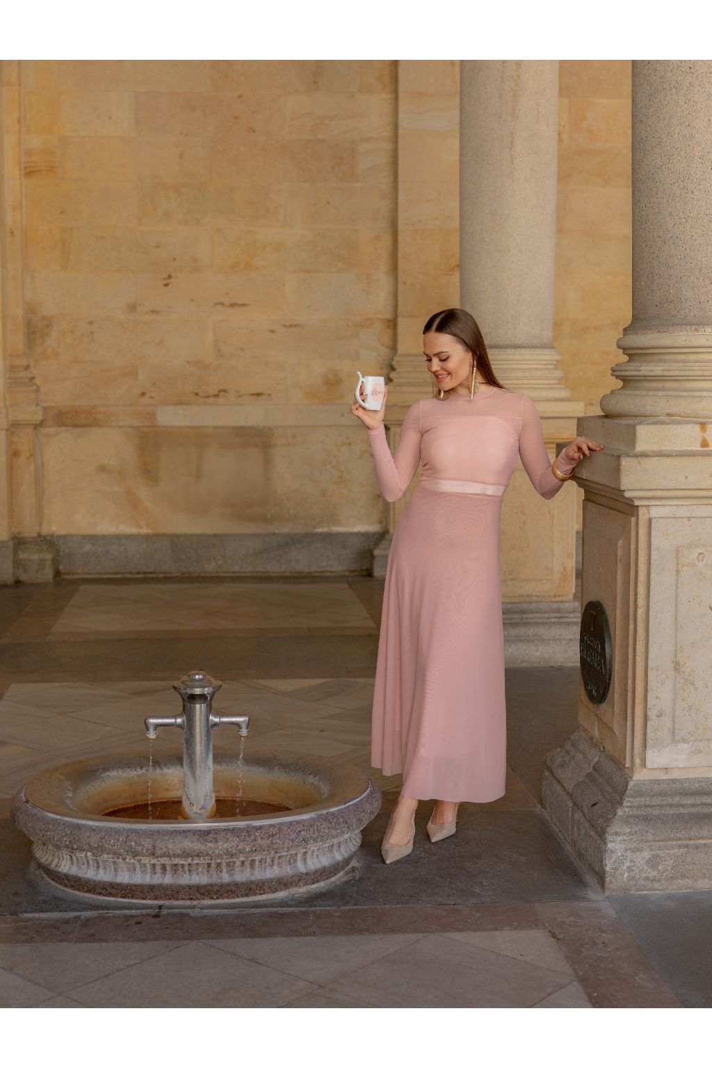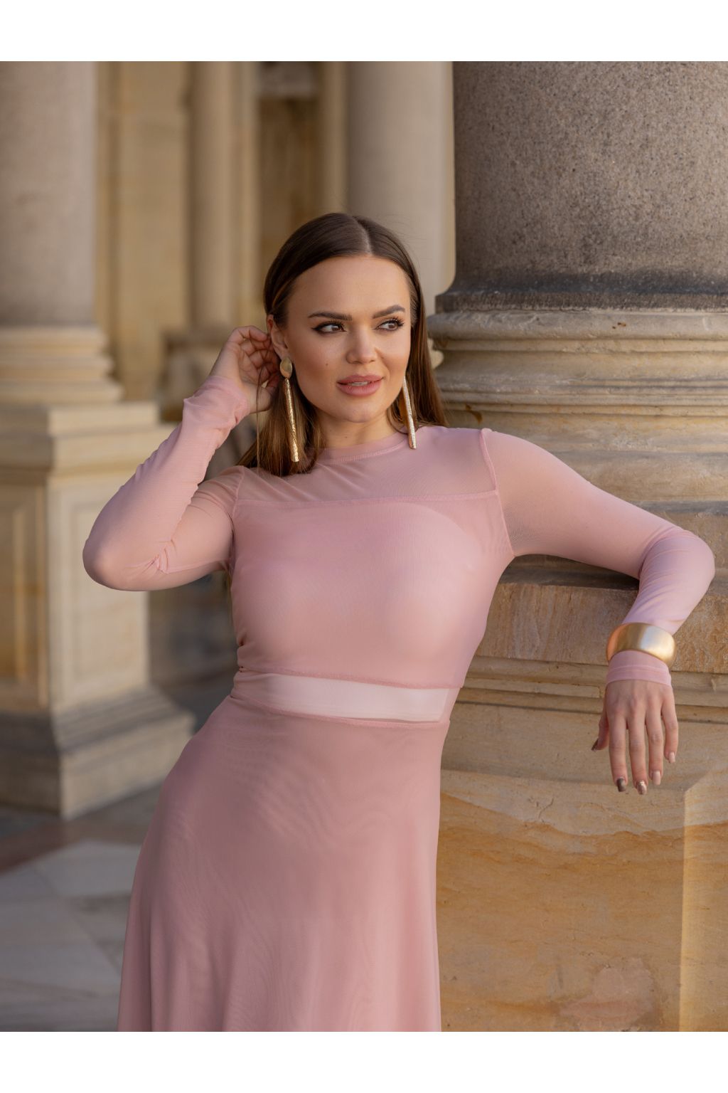 Transparentní části v horní části a v pase vytváří zajímavý detail, který model ozvláštňuje, aniž by působil výrazně. Šaty lze stylovat s topem nebo crop topem pod nimi, což umožňuje variabilitu a přizpůsobení podle příležitosti.