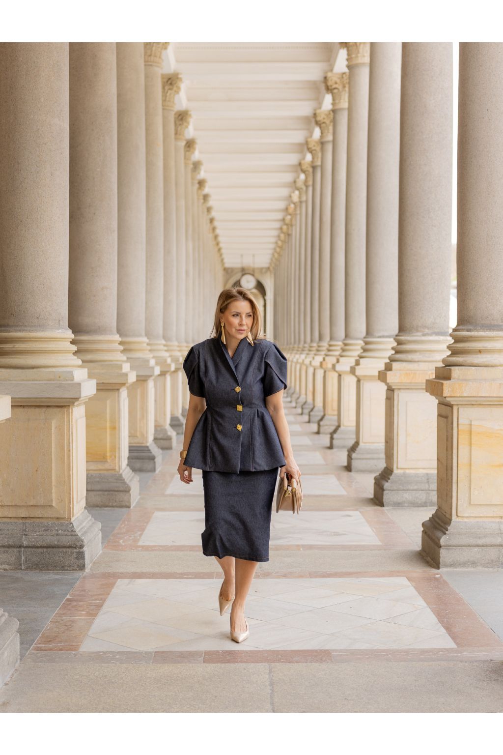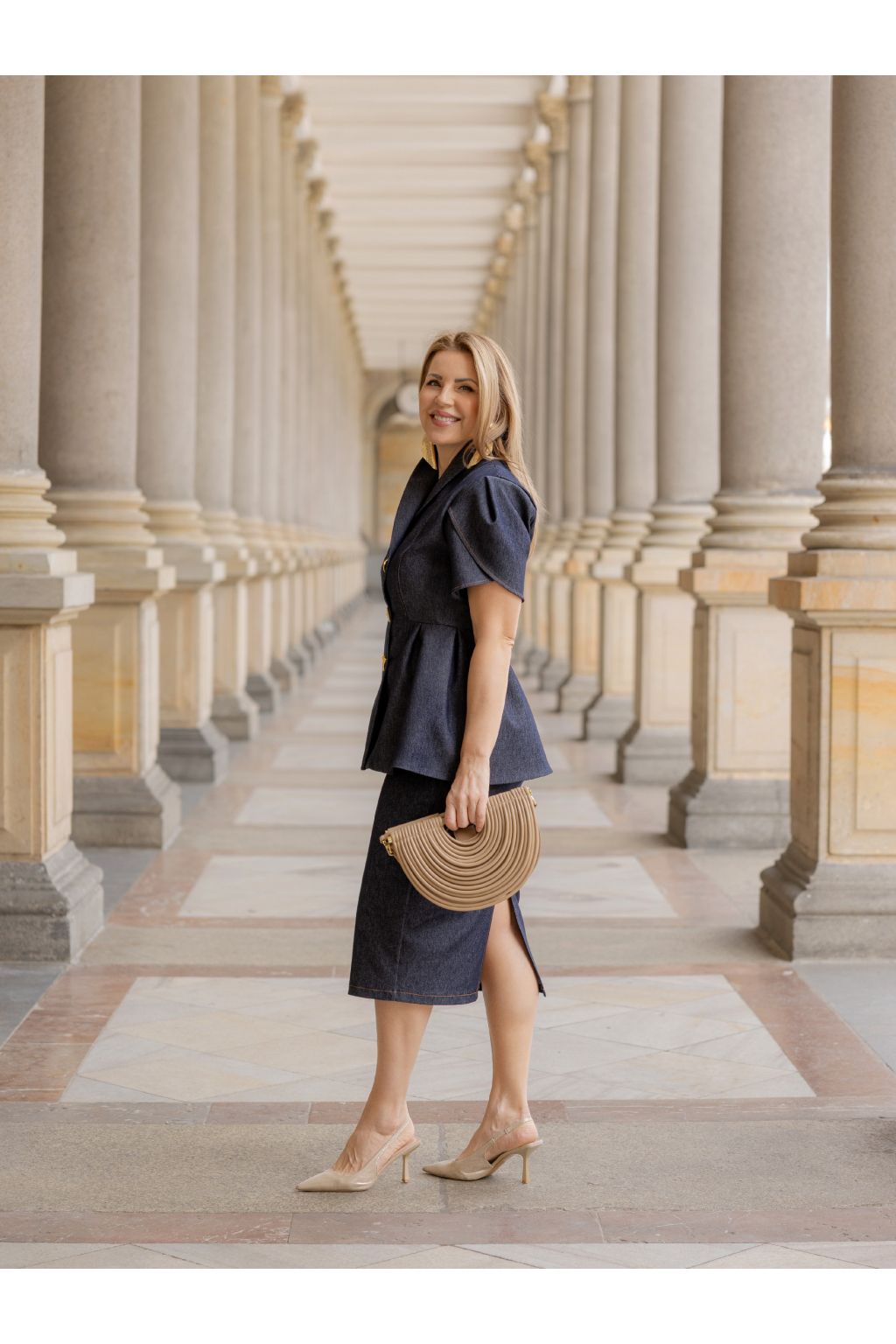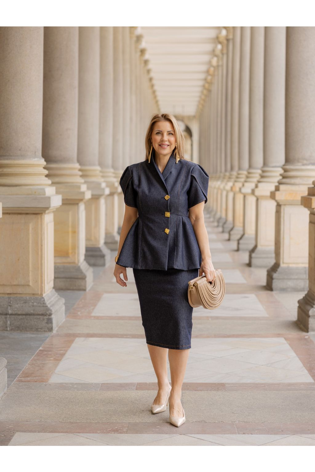 Dámské šaty v hlubokém tmavě modrém odstínu představují dokonalou kombinaci elegance a moderní ženskosti. Model se skládá z propracovaného topu s krátkými rukávy a pouzdrové sukně, která krásně kopíruje siluetu.