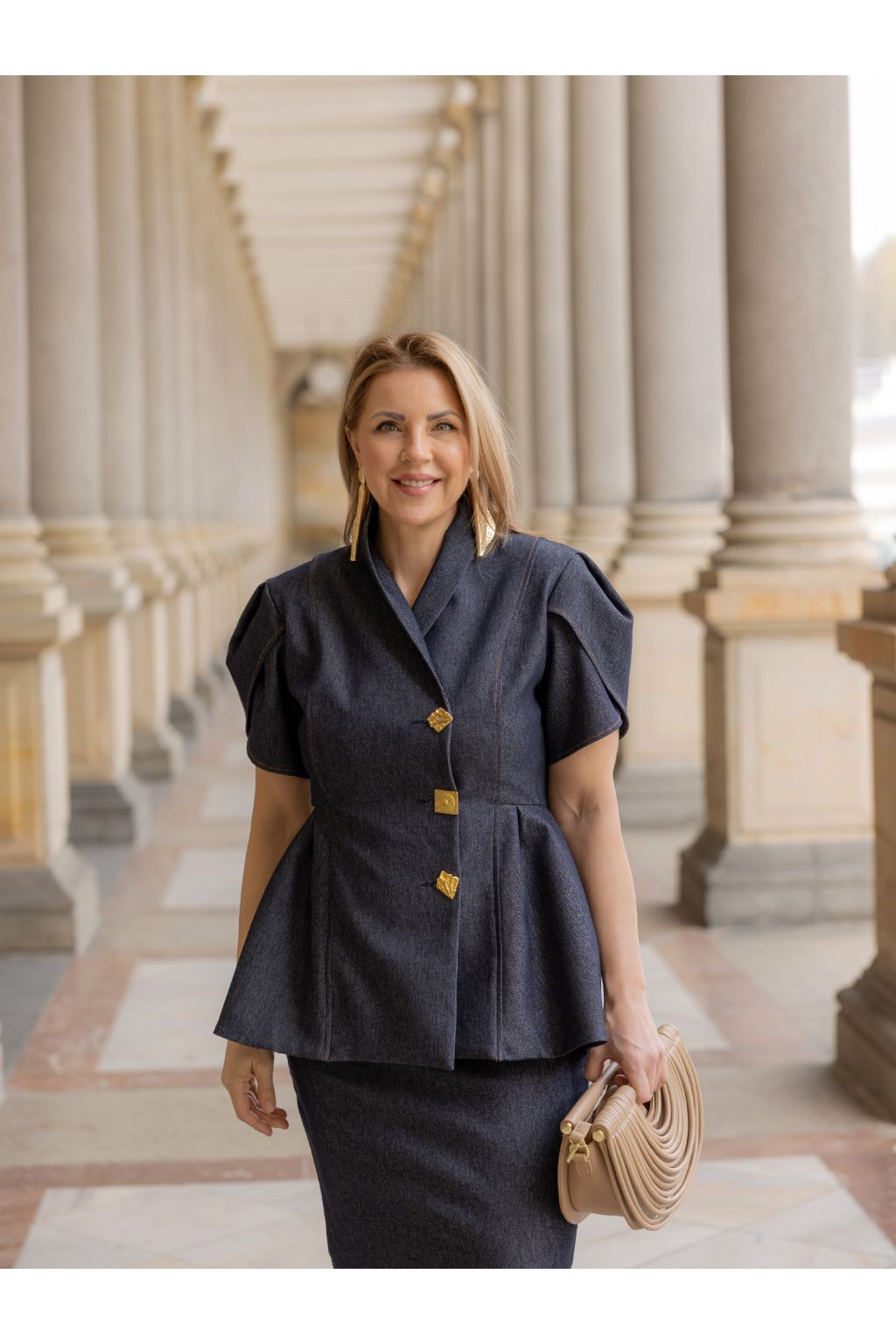 Vrchní díl zaujme strukturovaným střihem, zvýrazněným pasem a výraznými rukávy, které dodávají outfitu jedinečný charakter. Decentní zapínání na ozdobné knoflíky podtrhuje jedinečný design.
