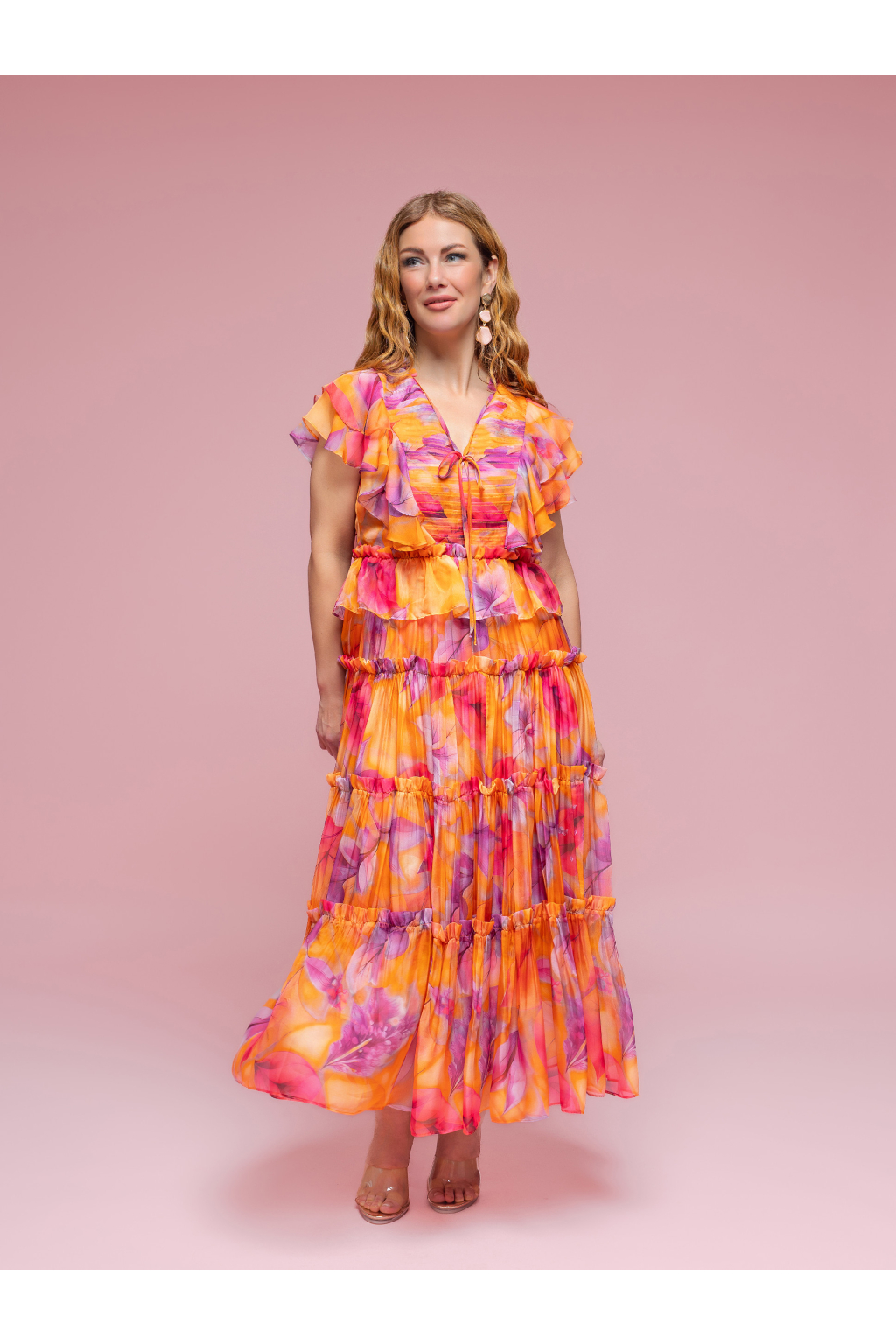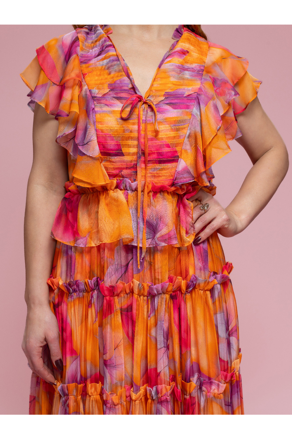 Lehké, éterické a nepřehlédnutelné. Tyto dámské šaty v oranžovo-fialových tónech zaujmou na první pohled svou barevností, vzdušným materiálem a promyšlenými detaily. Jemně transparentní látka působí velmi lehce a romanticky, zatímco vícevrstvé provedení dodává šatům elegantní objem a pohyb.
