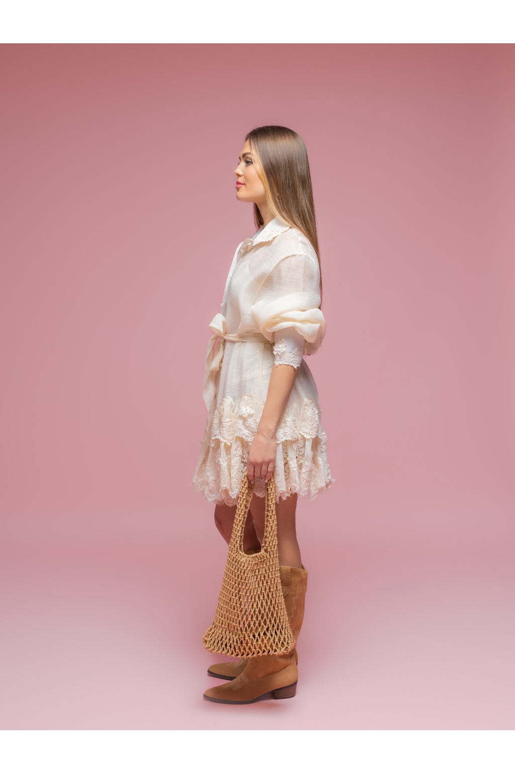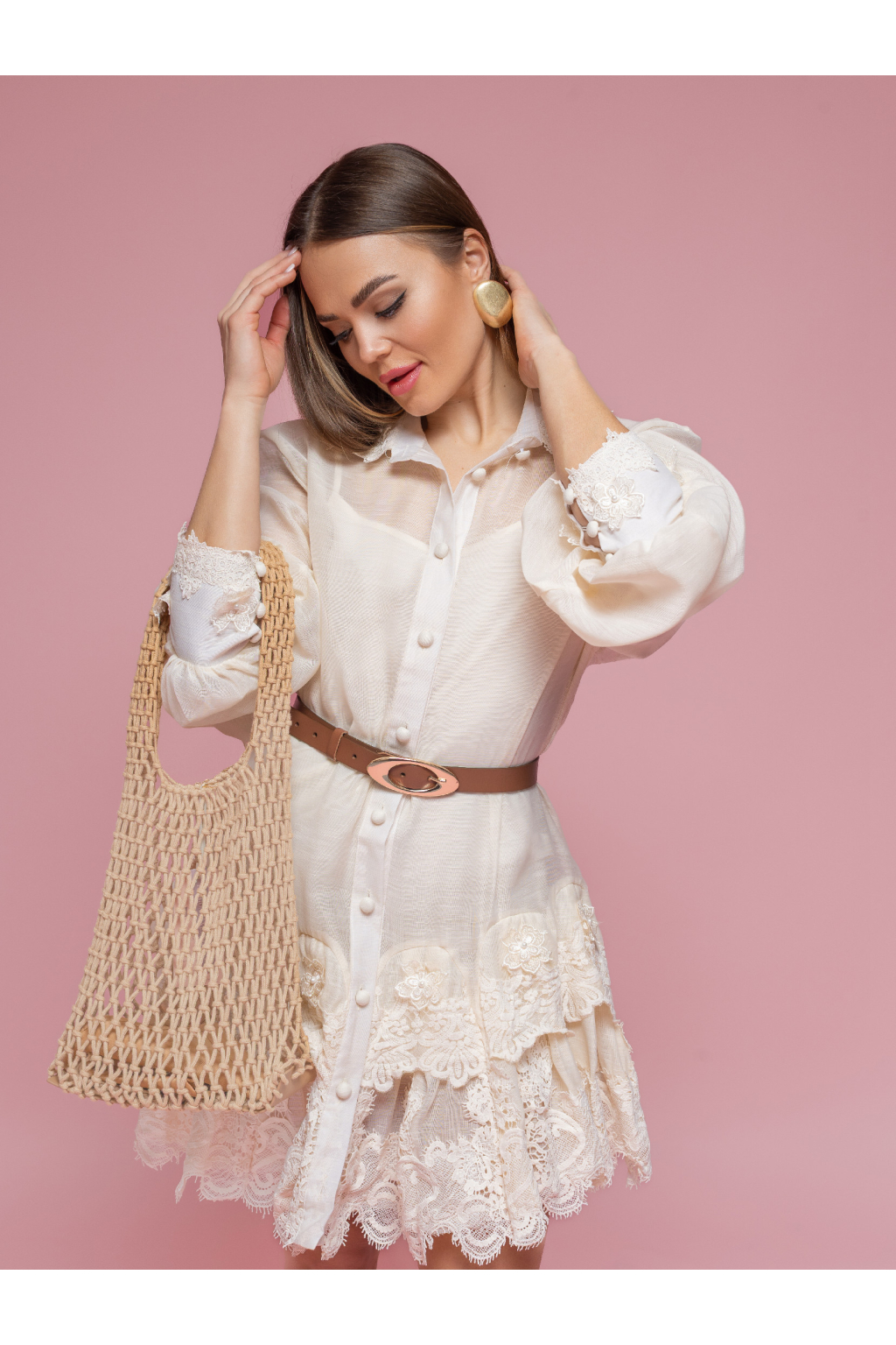 Elegantní dámské šaty ROMA v krémové barvě z přírodního materiálu (bavlna a len) s jemnými krajkovými detaily.