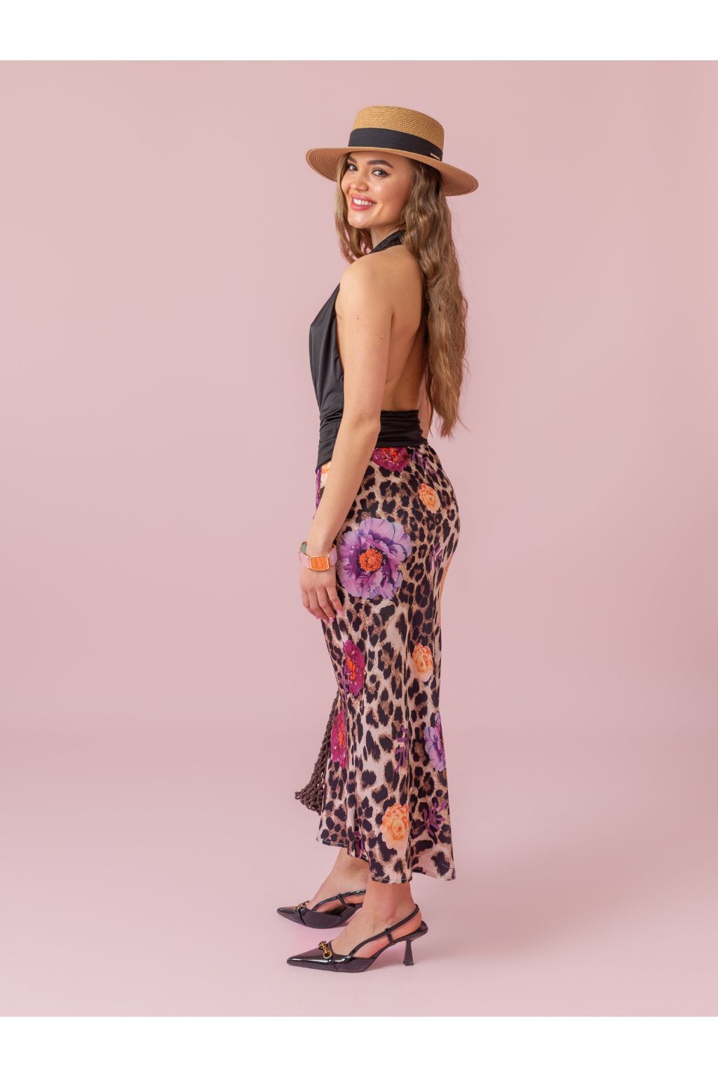 Stylová midi sukně s leopardím vzorem a výraznými květinami.