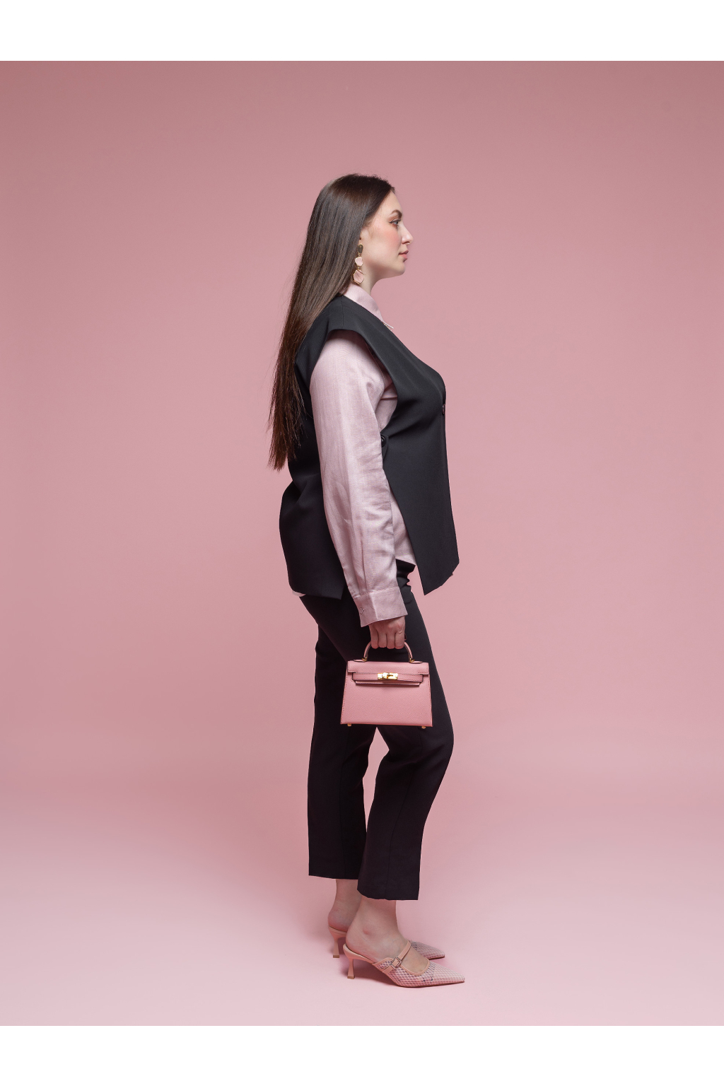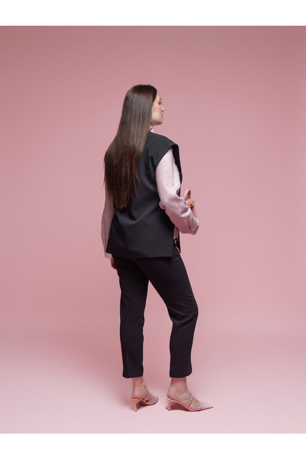 Vesta má hlubší V výstřih a zapínání na knoflík, díky čemuž působí velmi elegantně a zároveň ležérně. Ramena jsou jemně tvarovaná, aby držela tvar a outfit působil upraveně i bez další vrstvy. Zadní díl je hladký, s čistým středovým švem, který podtrhuje jednoduchost celého modelu.