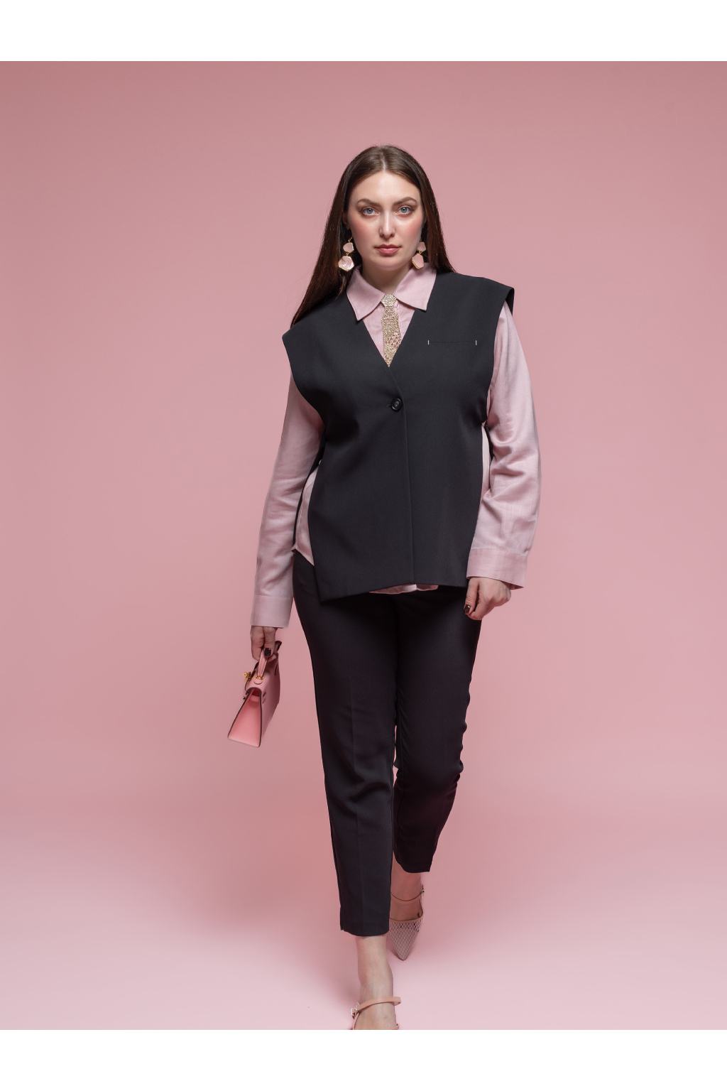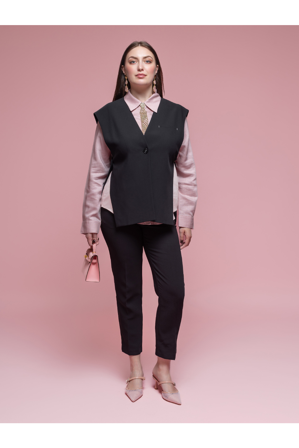 Materiál je příjemný, lehce pružný a dobře drží tvar, takže se vesta pohodlně nosí po celý den. Skvěle funguje jako samostatný prvek i jako součást vrstveného outfitu – přes top, halenku nebo pod sako či kabát.