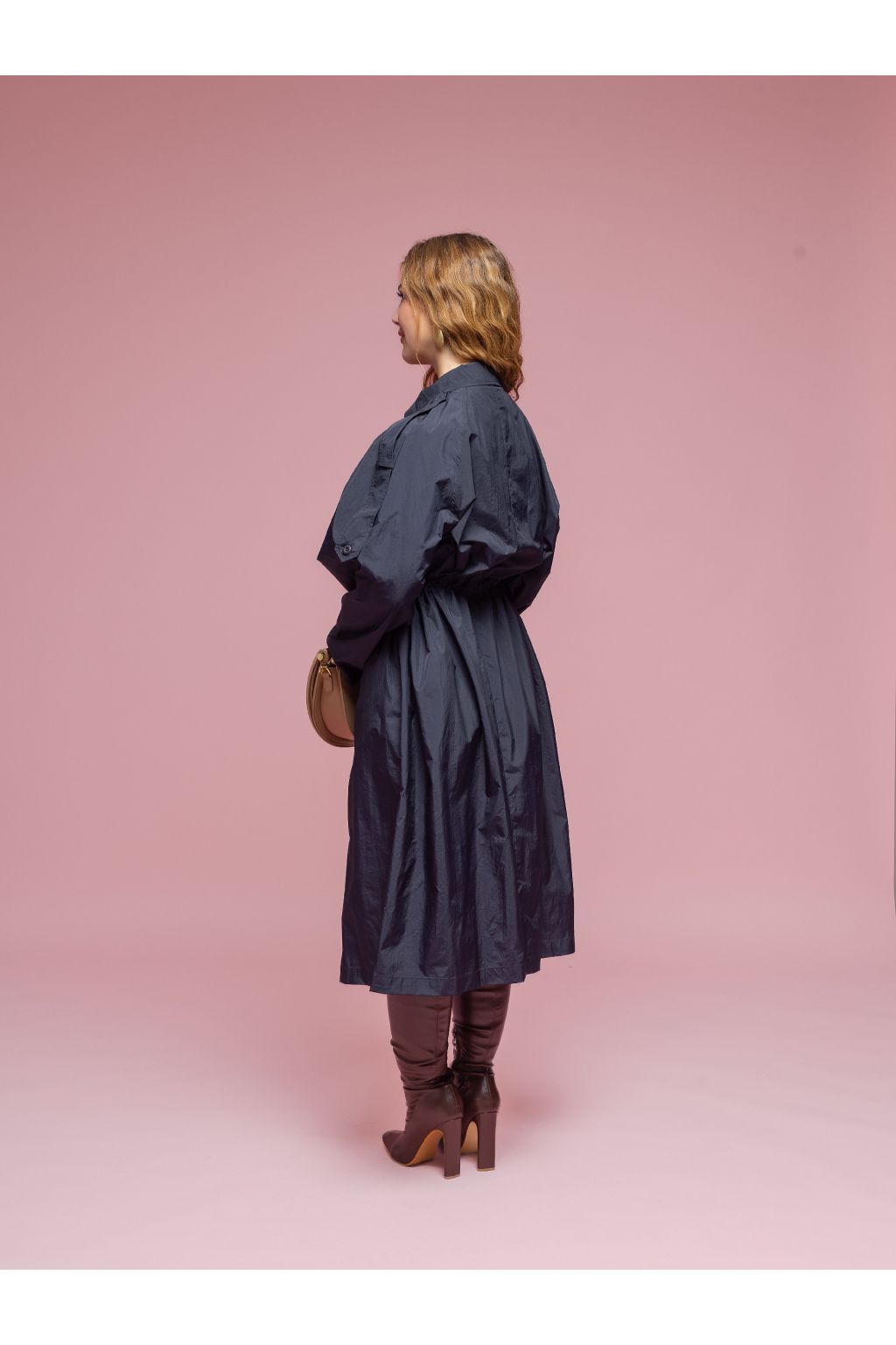 Lehká dlouhá větrová bunda v tmavě modré barvě s páskem v pase.
